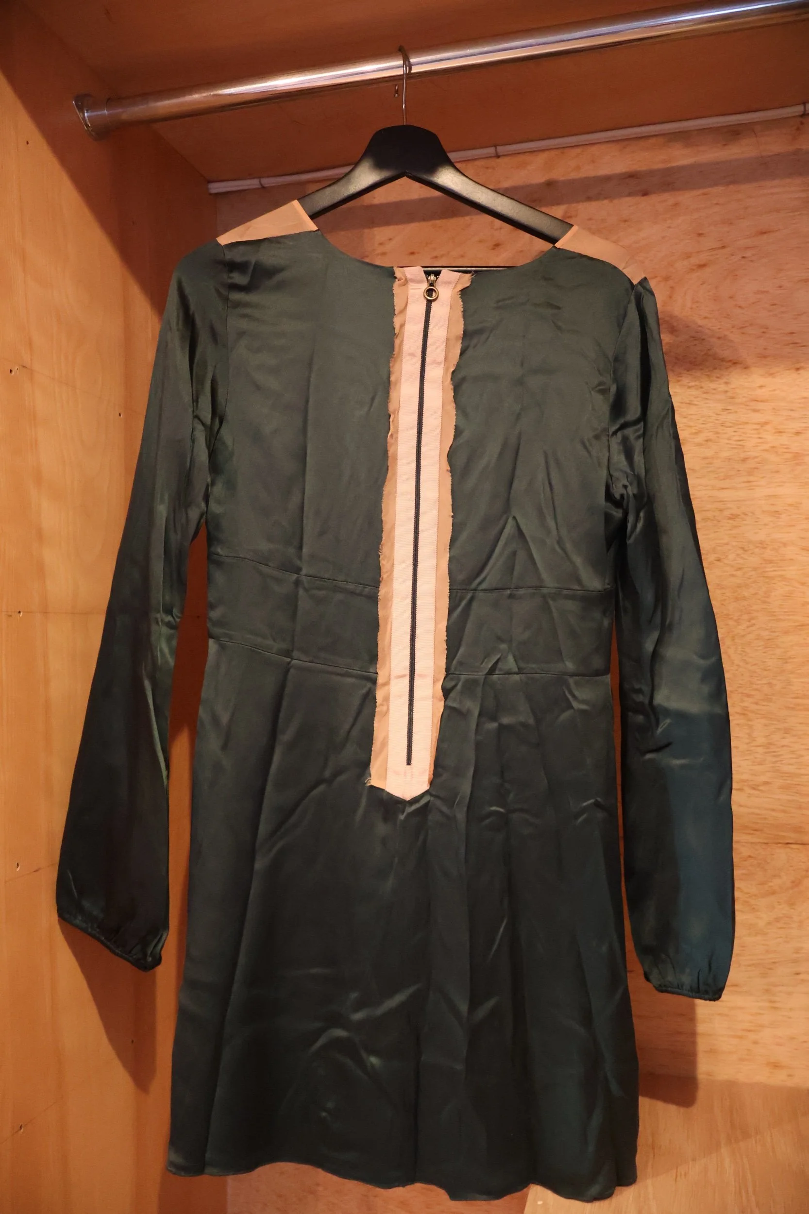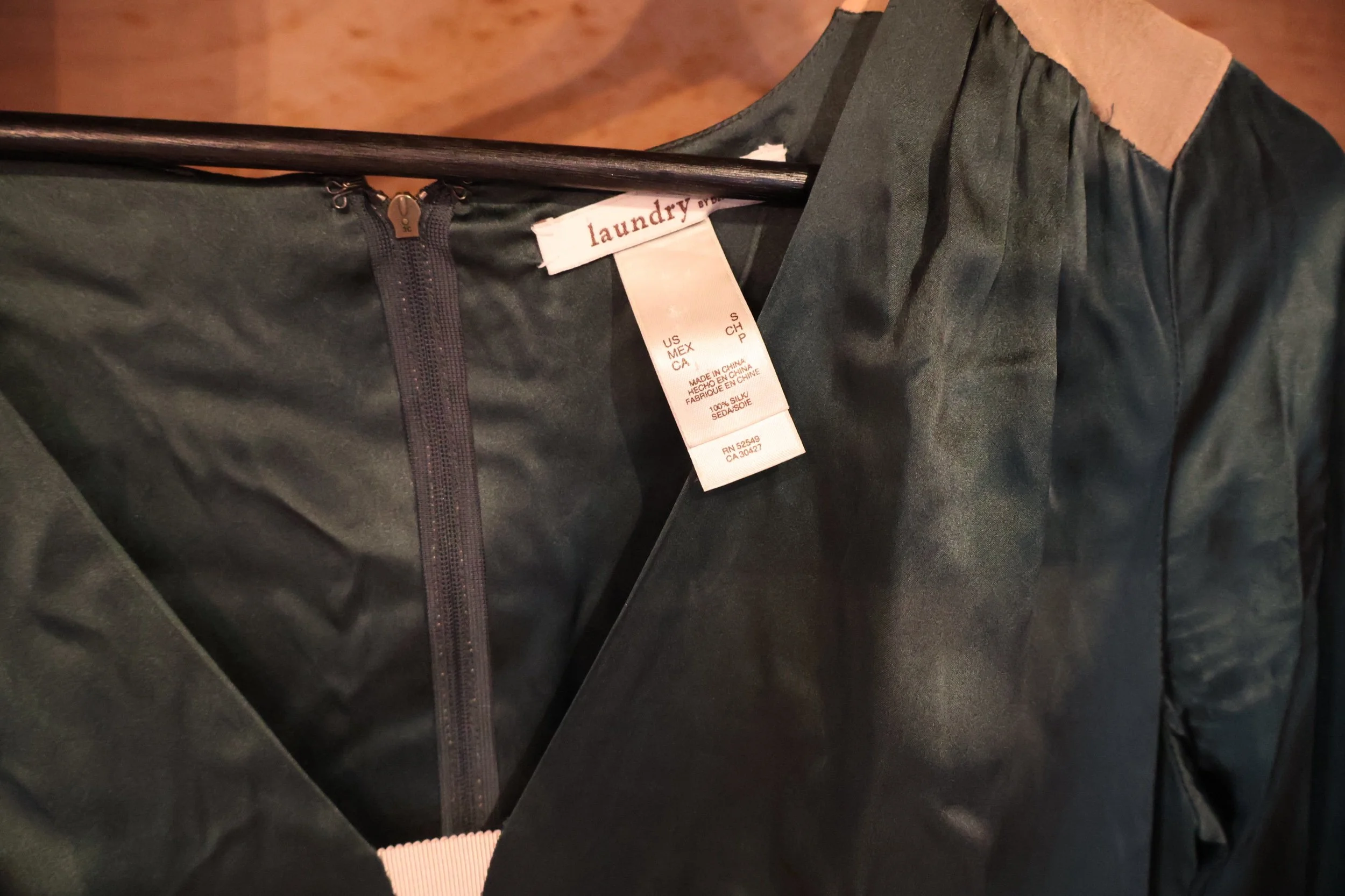 100% Silk Forest Green Empire Waist Deep V Dress with Champagne Accents by Laundry Size Small