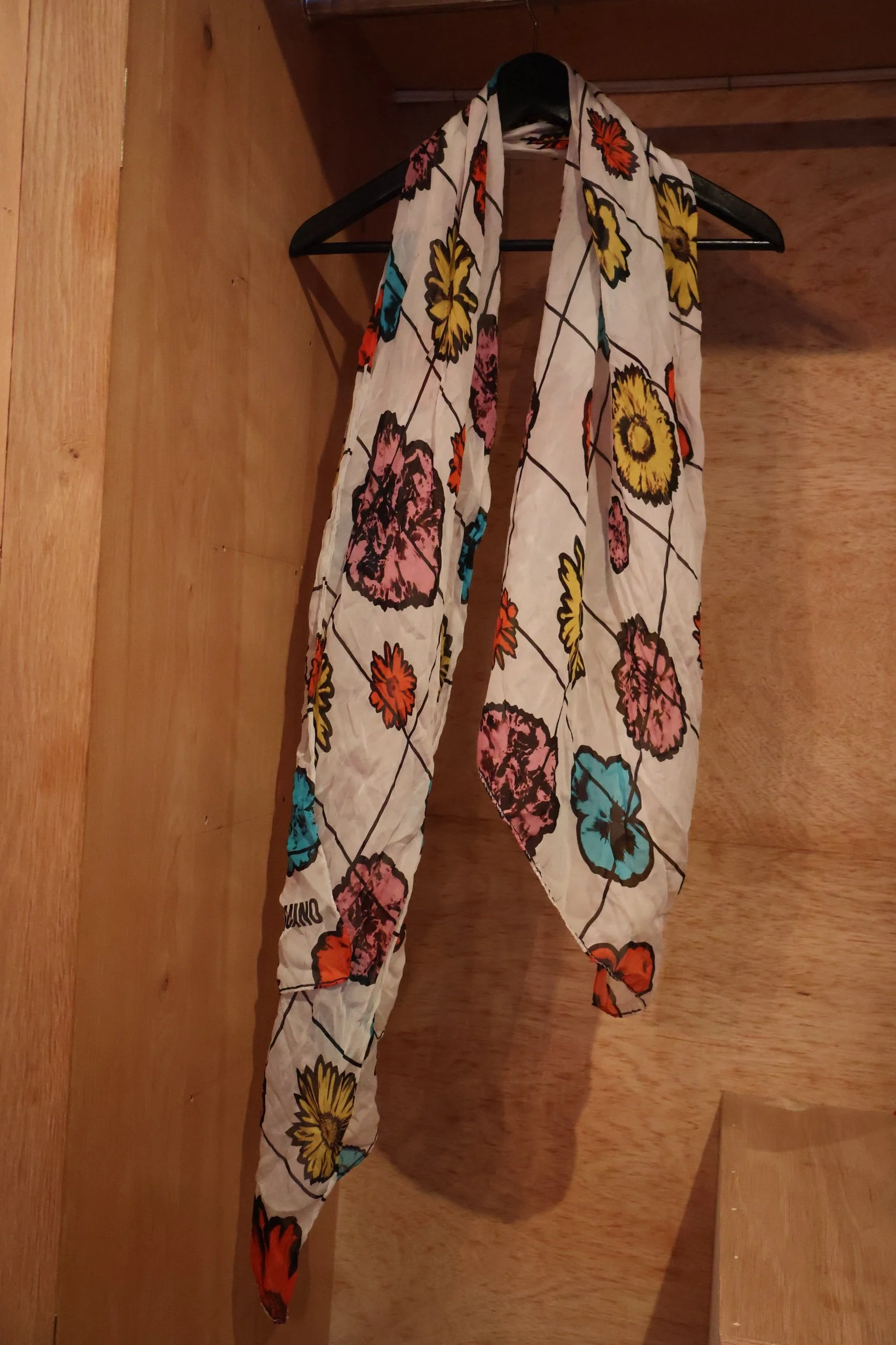 100% Silk Moschino Pop Art White Scarf with black windowpane pattern and floral negatives in pink, teal, sunflower and persimmon, made in Italy, approximately. 72×24”. No signs of wear, perfect condition and ready to be delivered for free to NYC or shipped nationwide.A