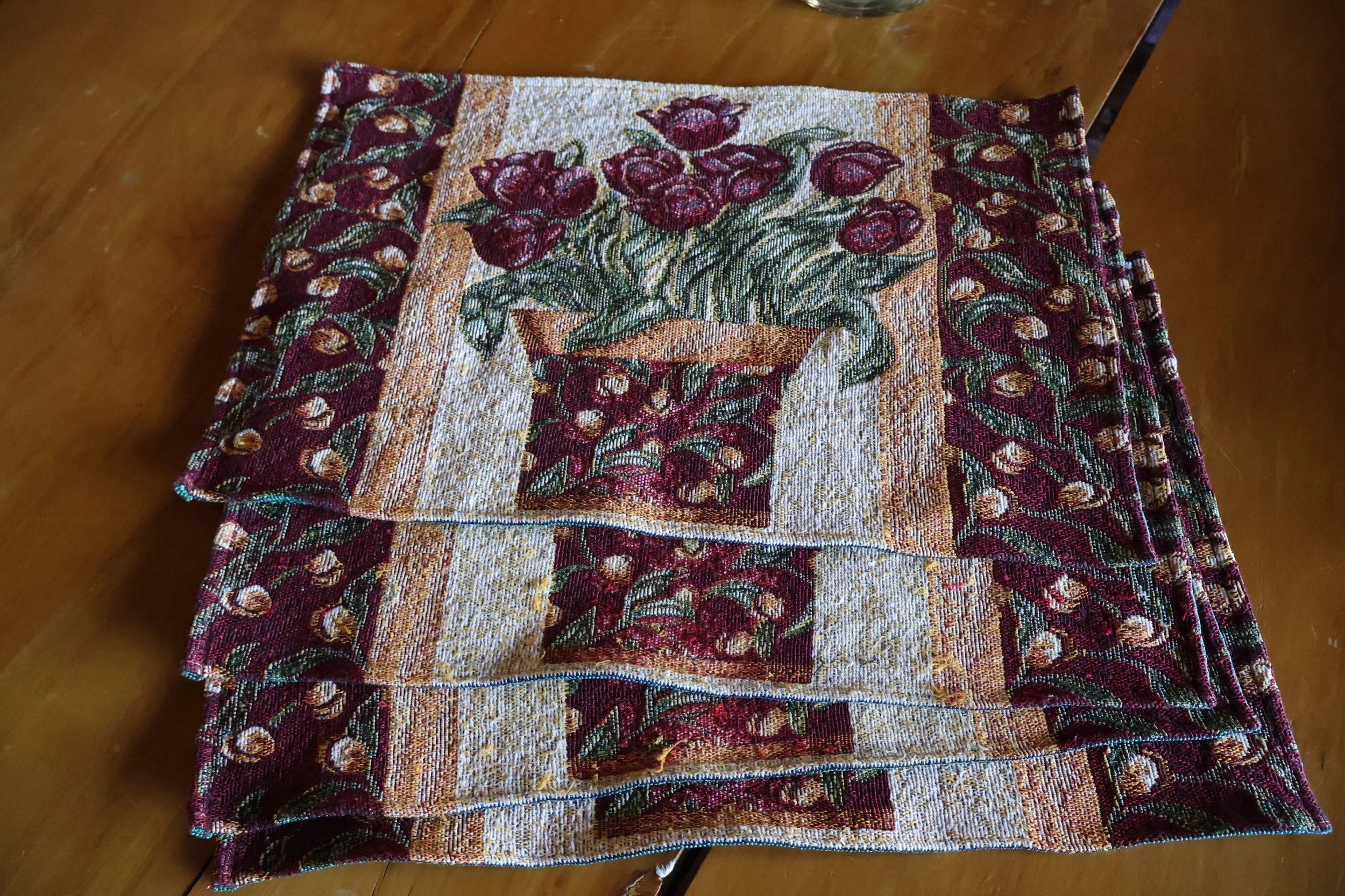 4 Maroon & Gold Tulip Placemats Approx. 24x14" in perfect condition, never used. These are incredibly 90s coded with the maroon and gold power clashing and bucket of tulips taking center stage. Unbacked. Delivered for free to NYC and shipped nationwide.