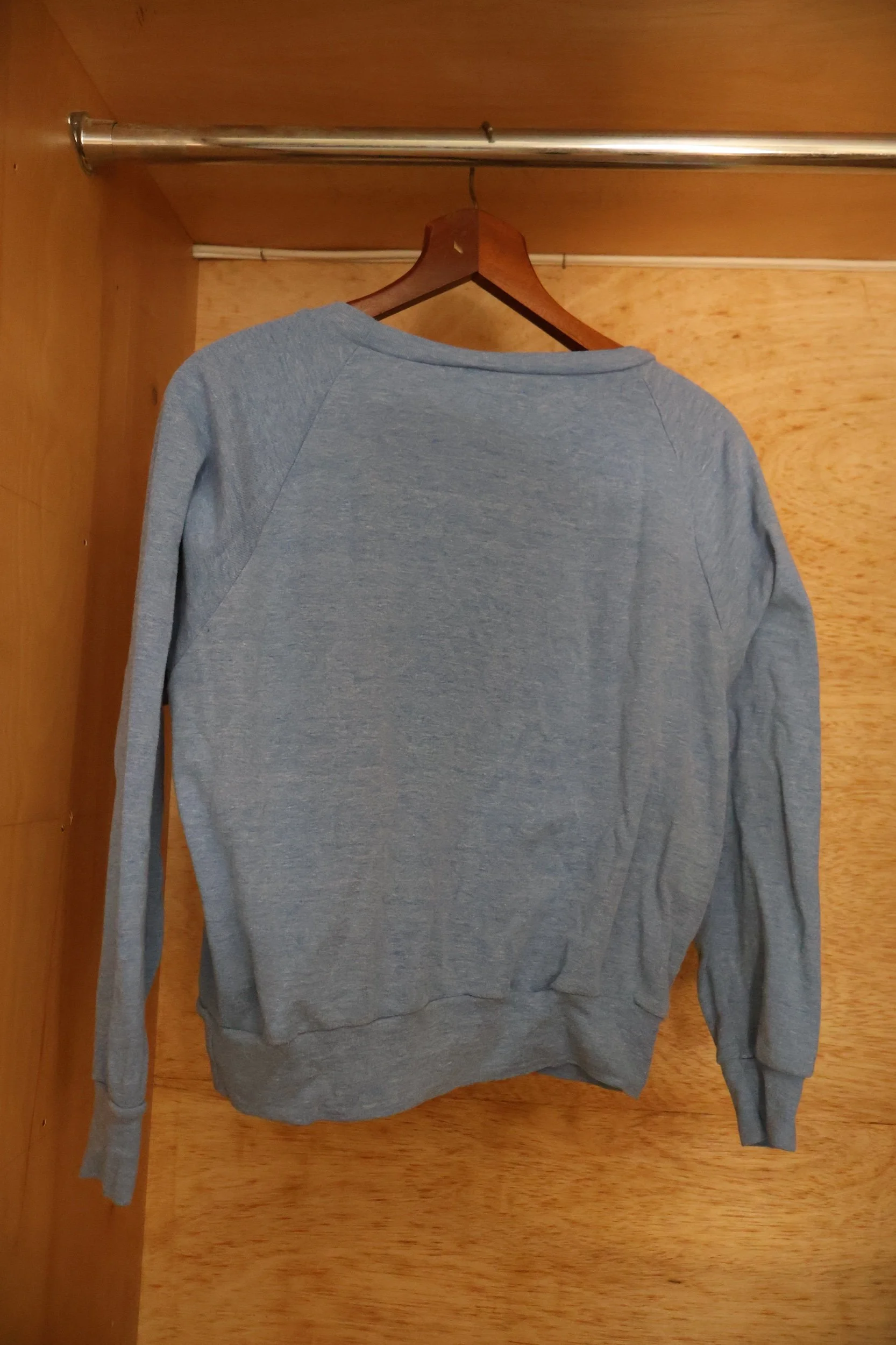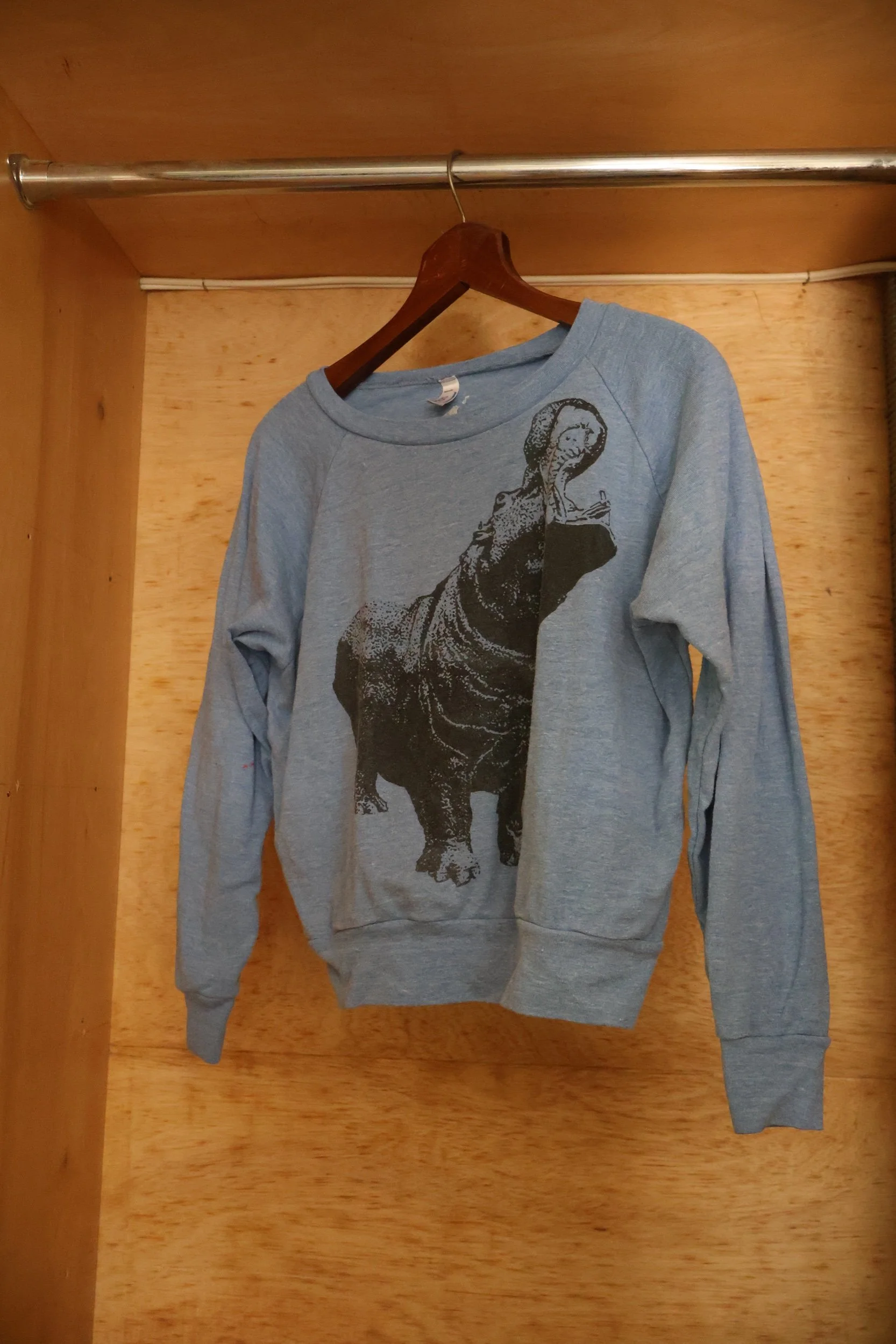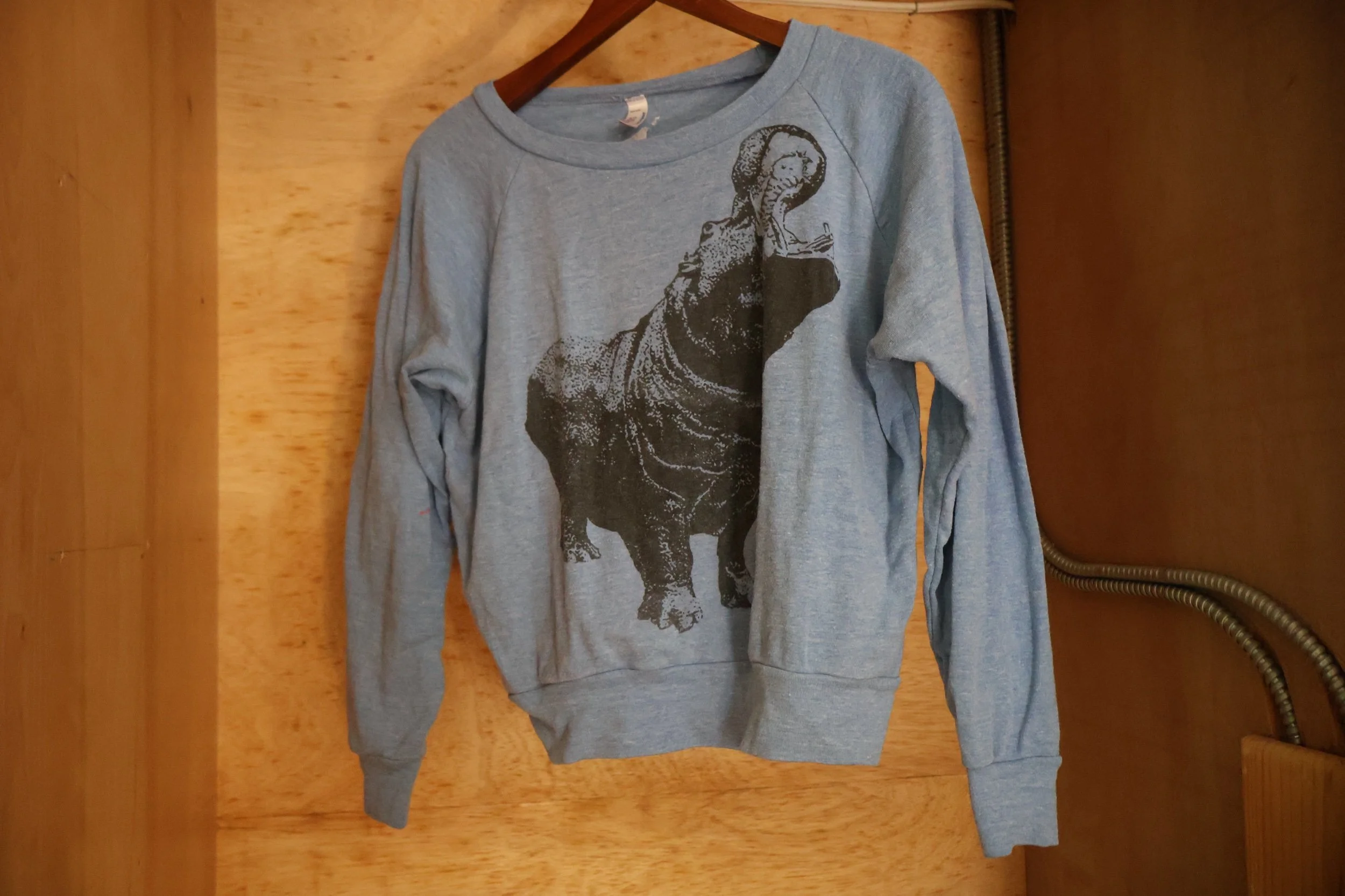 Is this hippo crying for help based on the No Sweat documentary? We hope not! Anyway size small light blue crew neck sweatshirt is super cute and ready for you. Delivered locally for free to MYC and shipped nationwide.