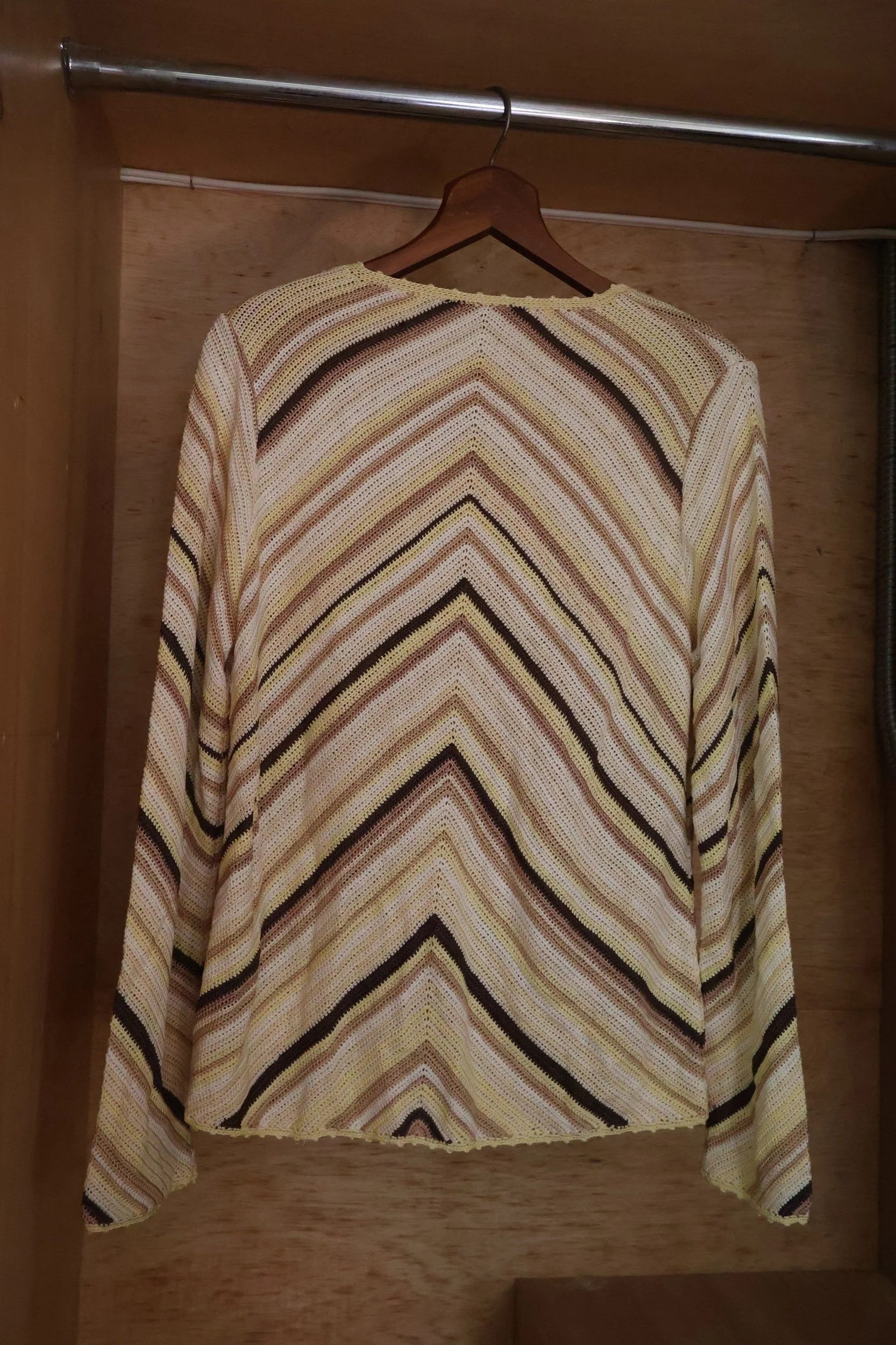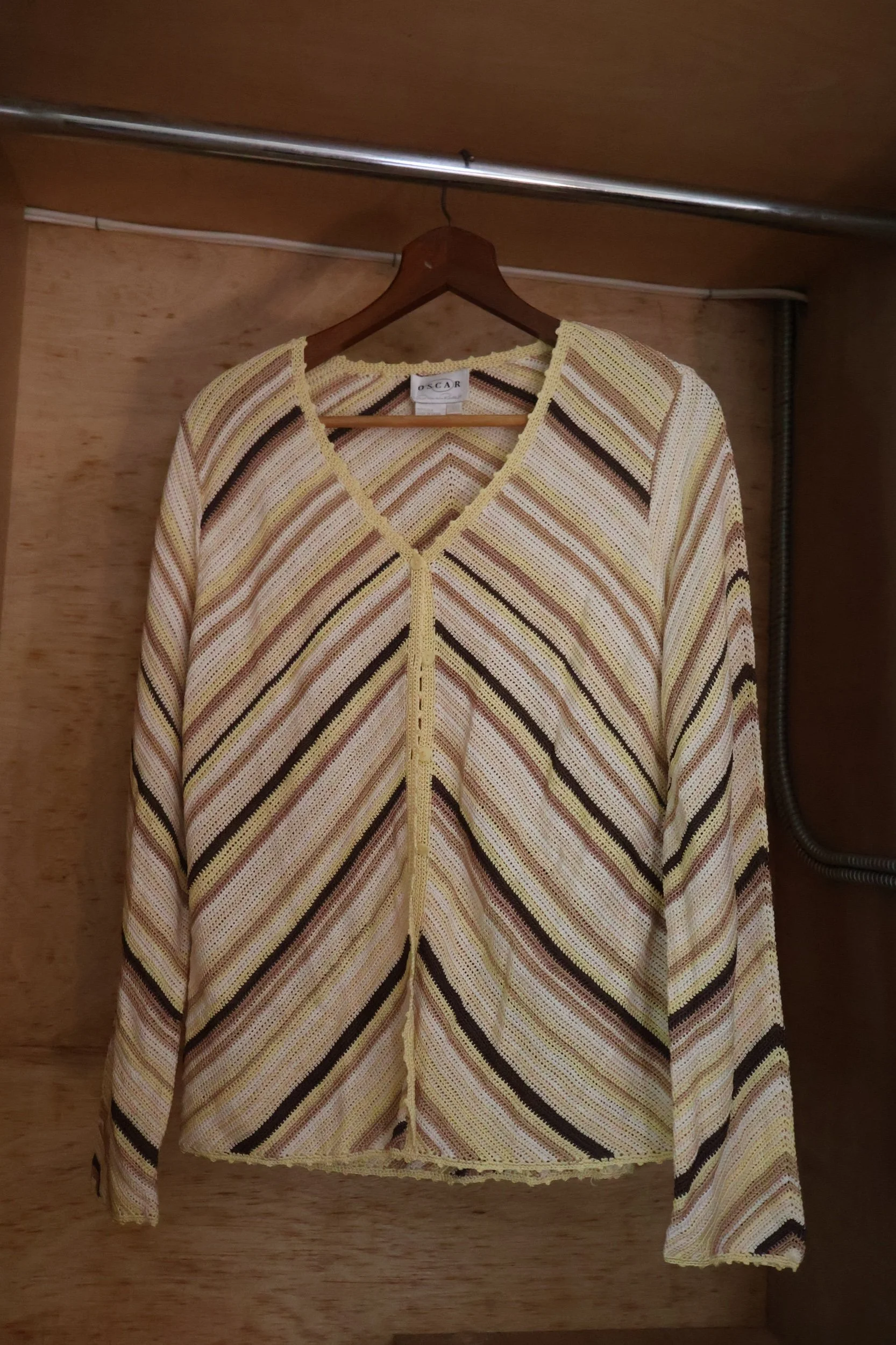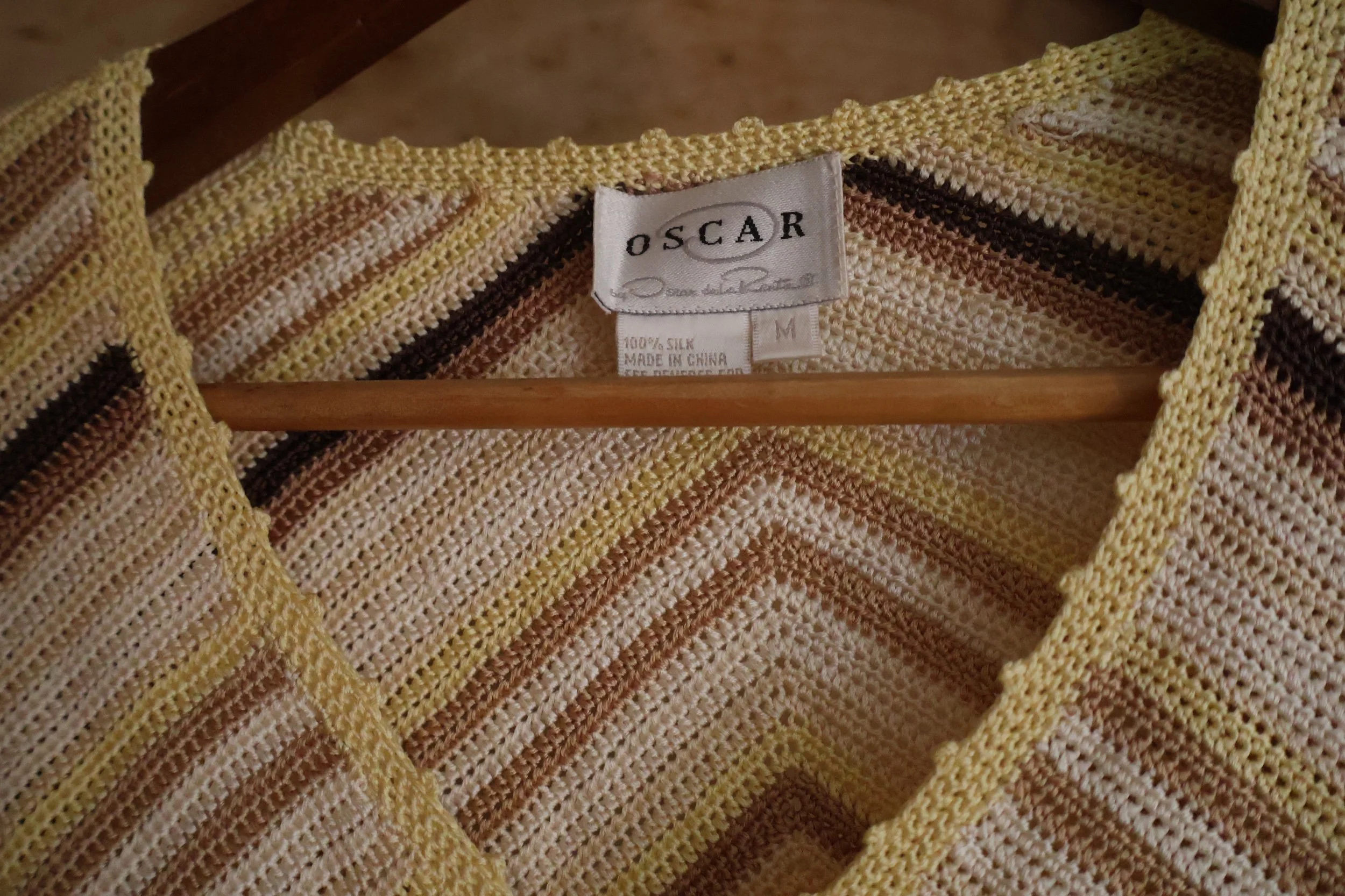 Gorgeous fall colored stripes of brown, yellow and cream woven through the silk of this vintage Oscar de La Renta cardigan. Size medium and delivered locally to MYC or shipped nationwide.