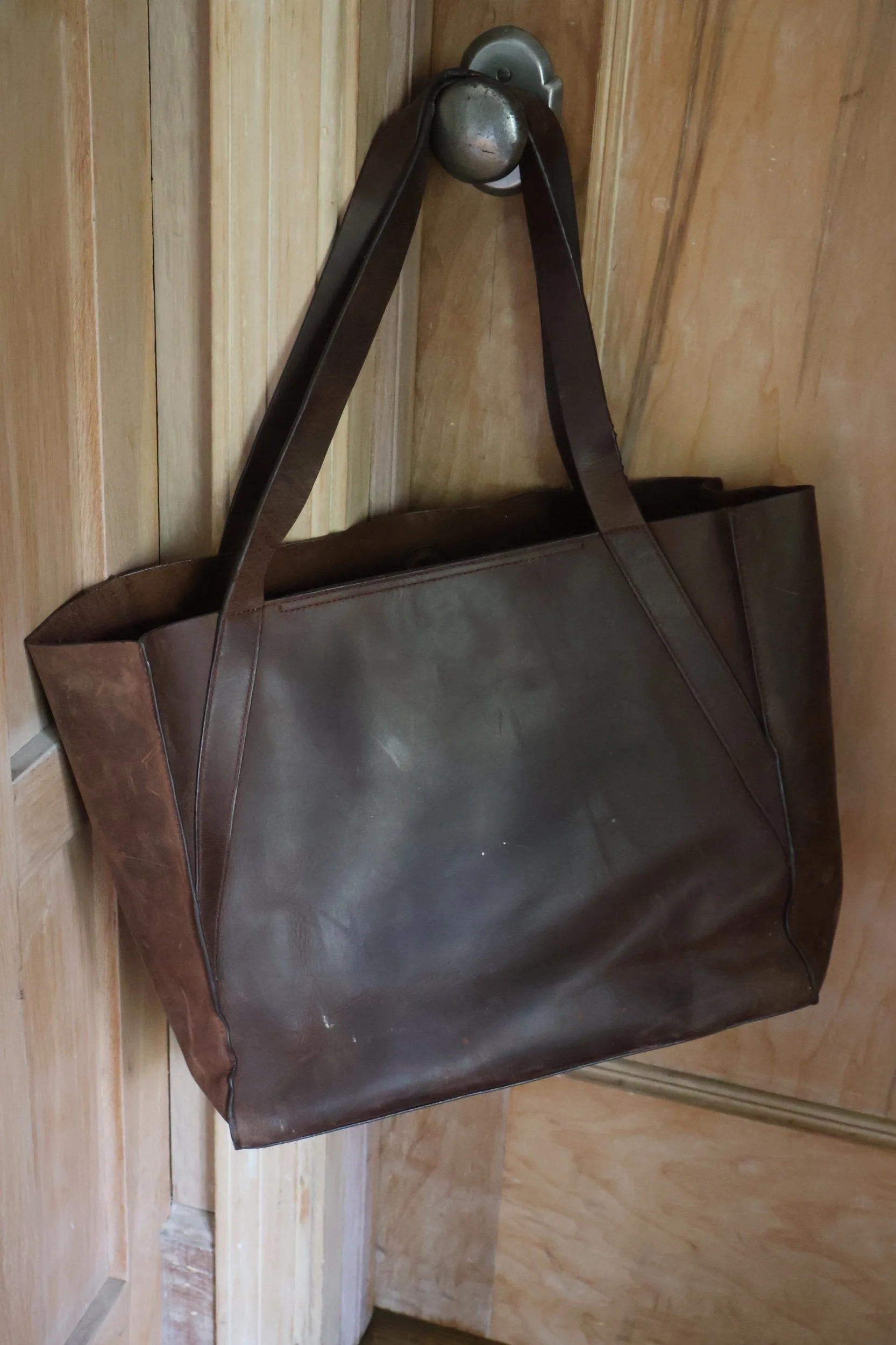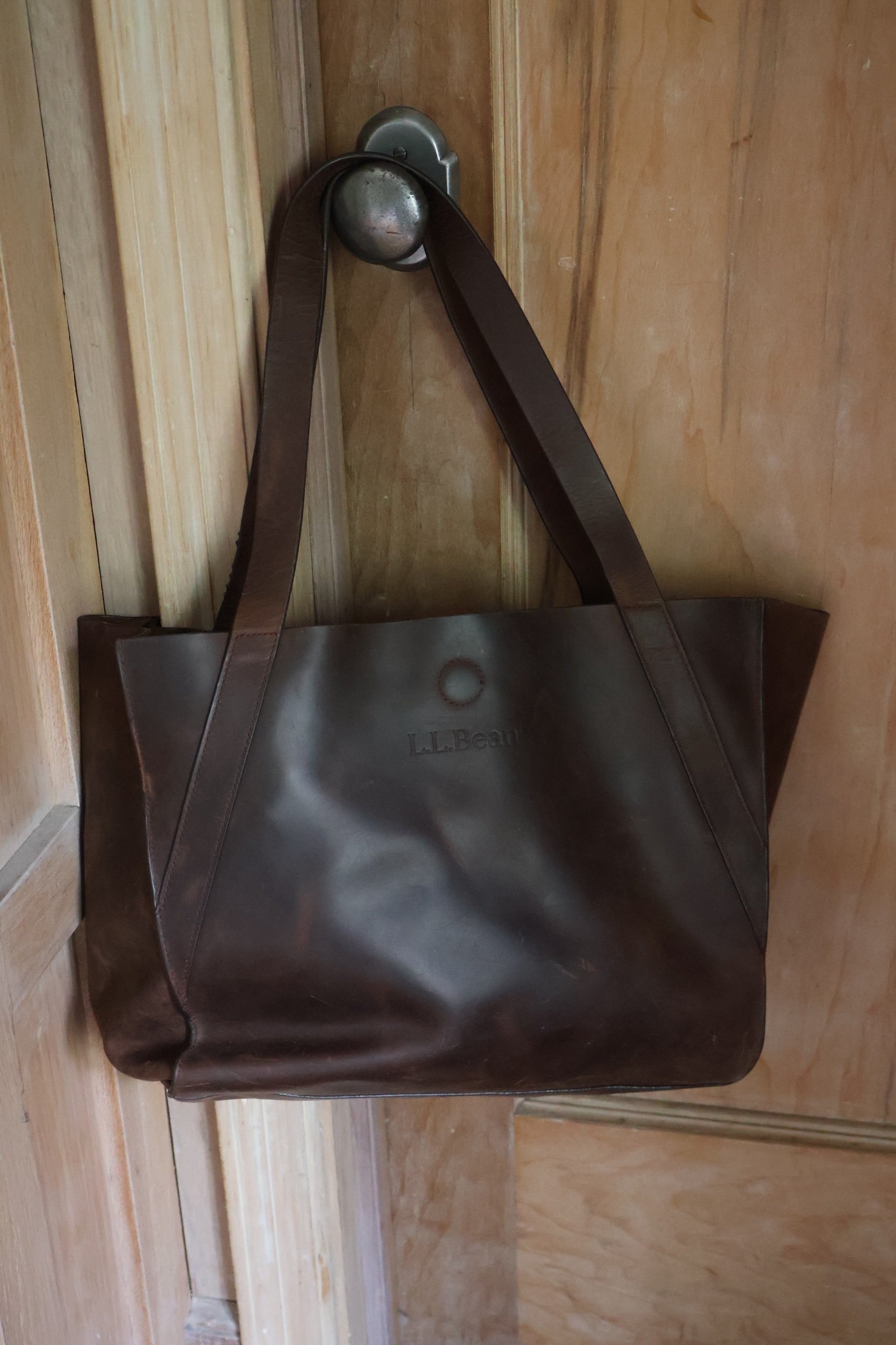 Brown Used Leather Tote by LL Bean shows some wear but has plenty of life left. Approximately 24×18” with 12” handles, this bag can hold it all and the classic brown goes with everything. An elevated way to tote your work or school life with you, this bag can be delivered to NYC for free or shipped nationwide!