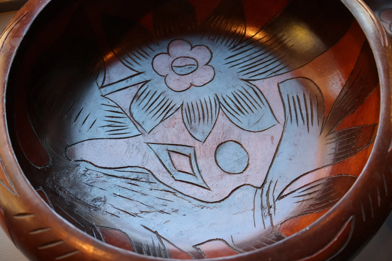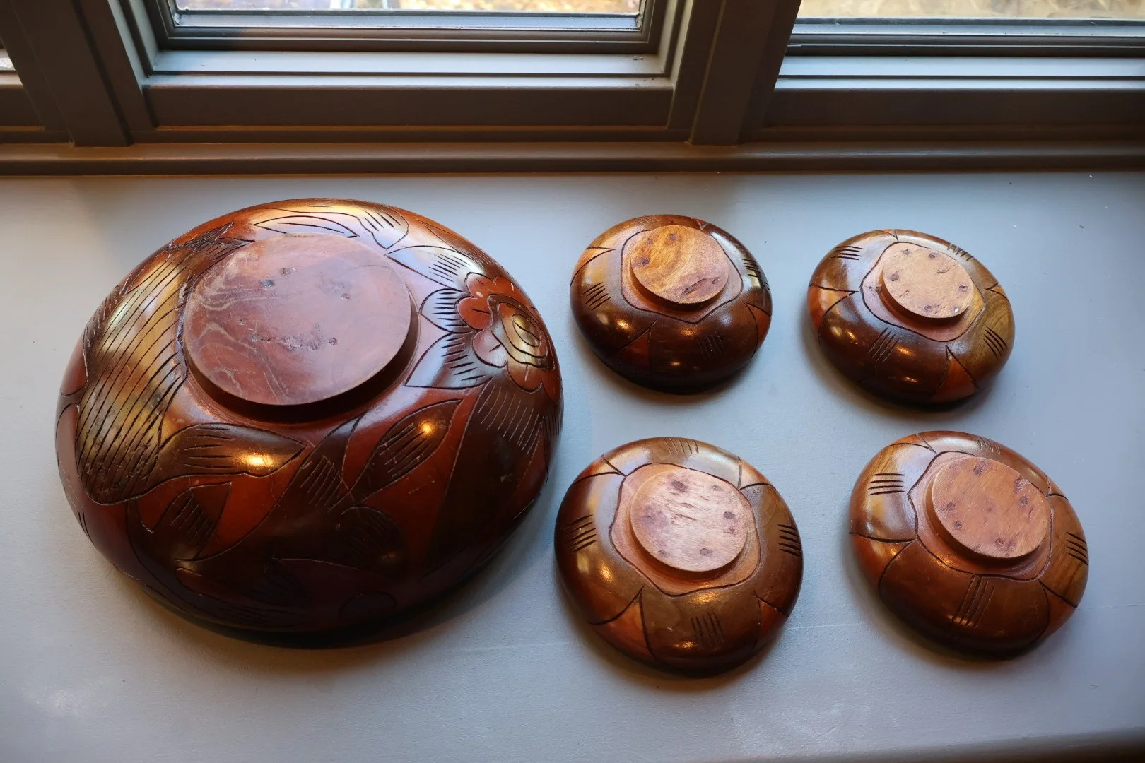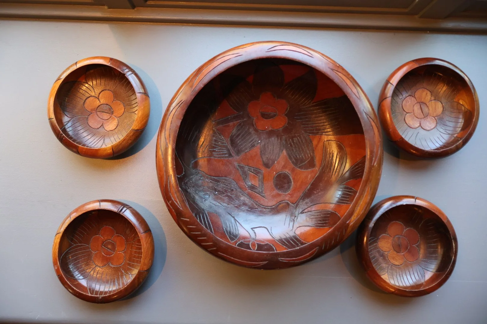 Hand-Carved Wooden Salad Bowl with Matching Serving Dishes featuring a floral design