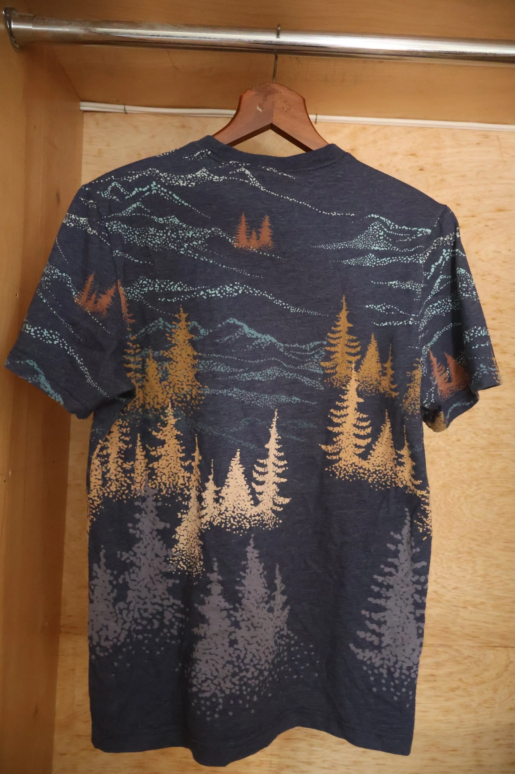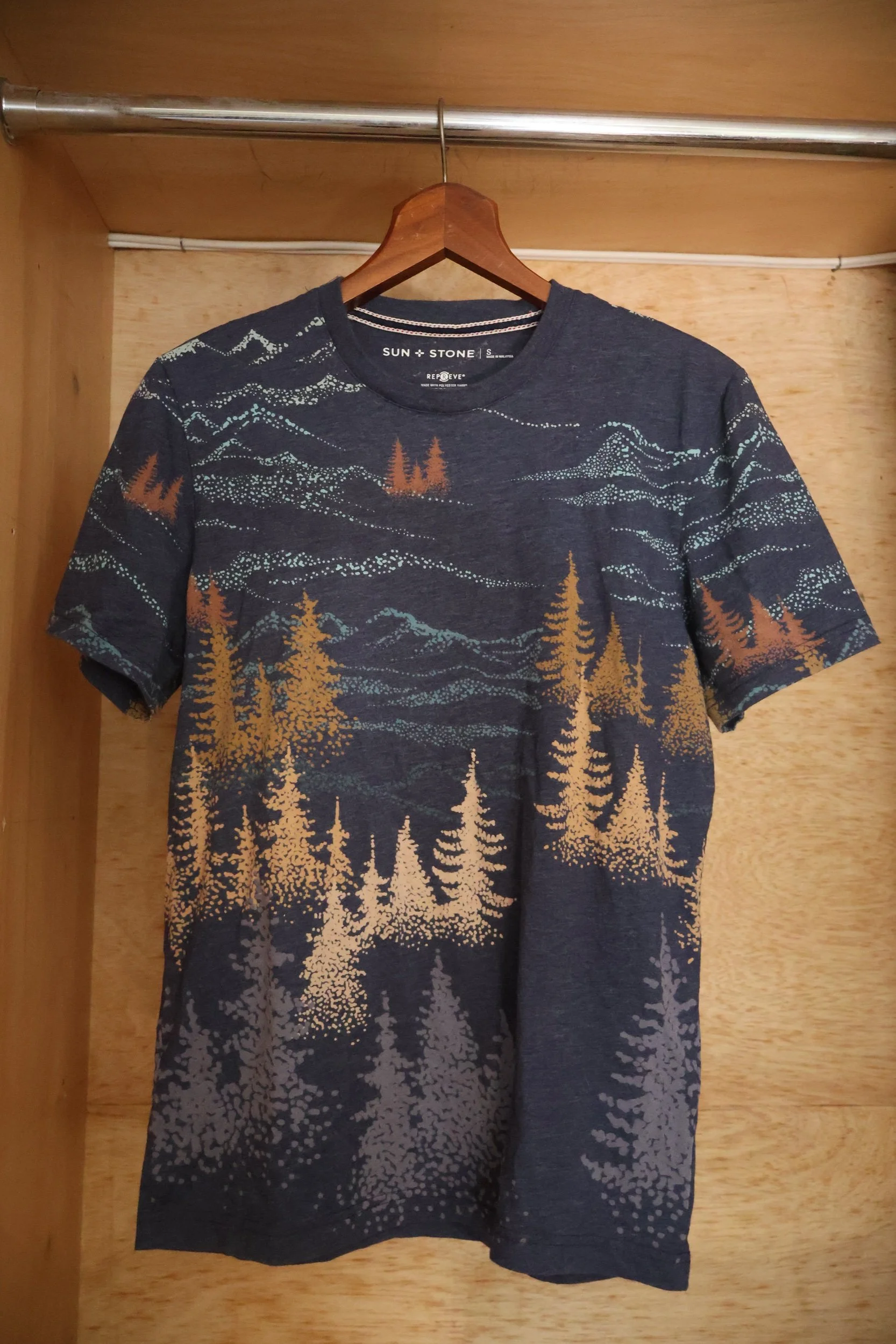Size small men’s t shirt 60% cotton 40% polyester made in Malaysia by Sand + Stone. Blues and browns are perfect for fall, delivering locally to NYC and shipping nationwide.