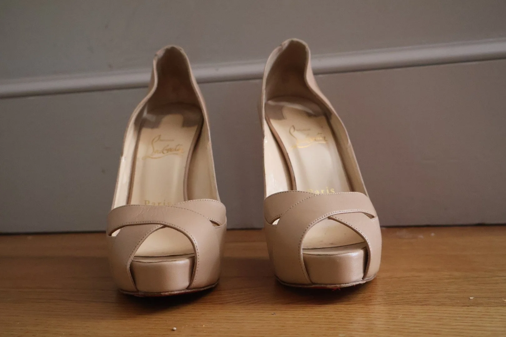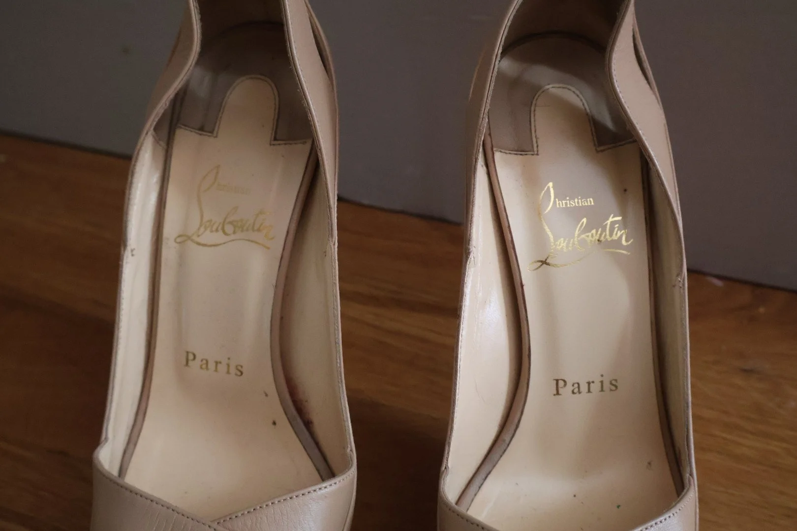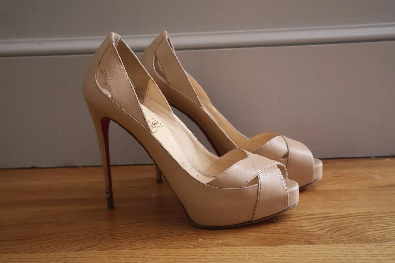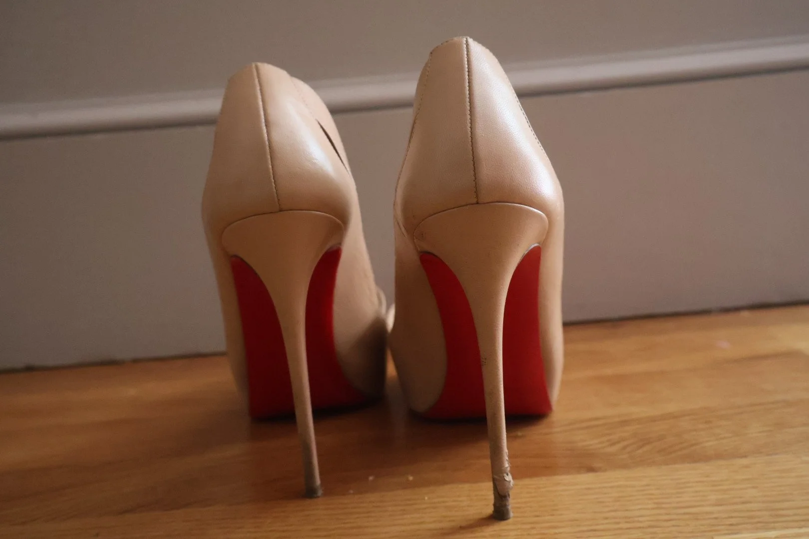 Some damage to one heel as pictured, but otherwise fabulous Louboutin heels with lots of life and love to give. Purchased from Barneys RIP in the early 2010s, worn seldomly because the heels are high and I am not that motivated. Pricing to reflect the damage but trust a trusty cobbler can help you bring these back!