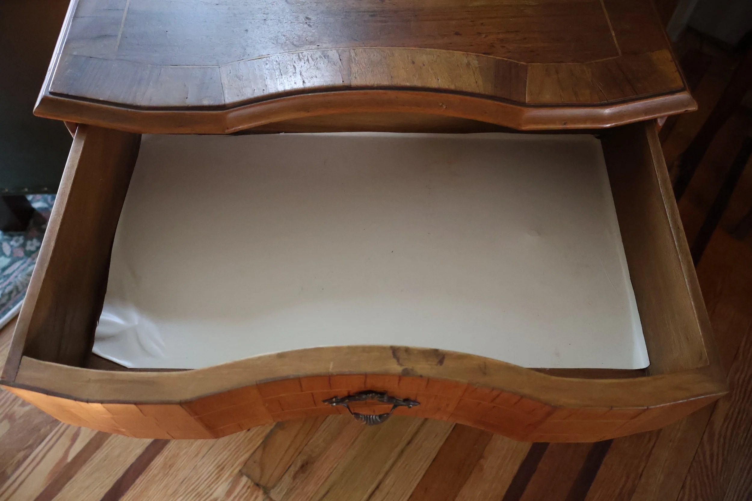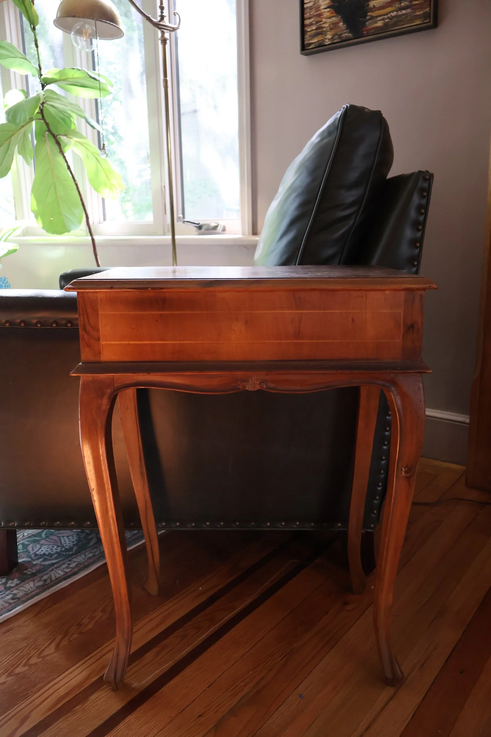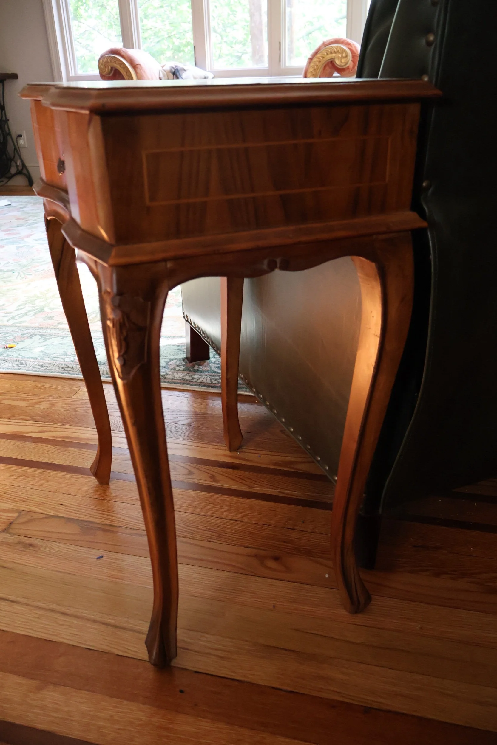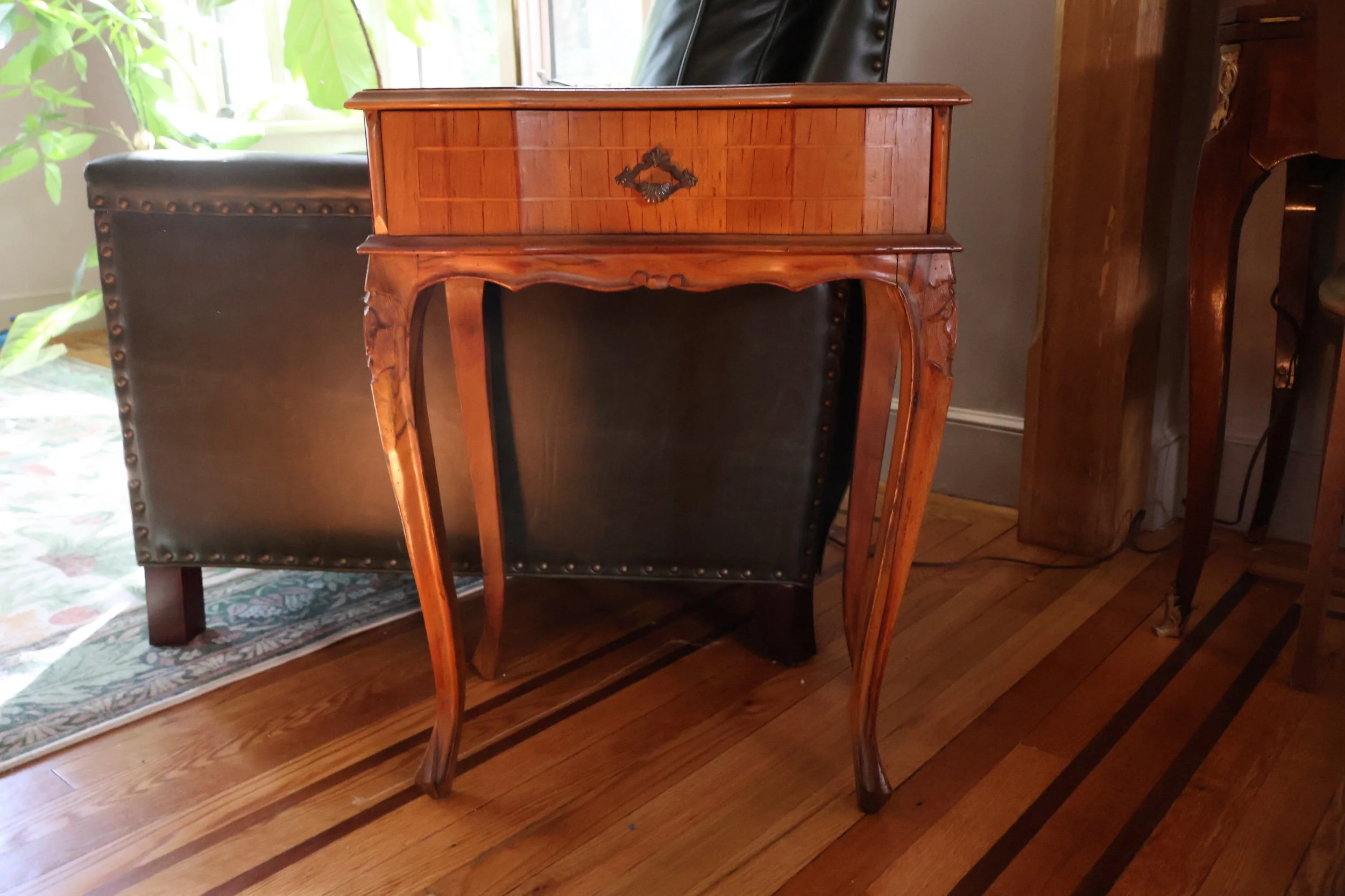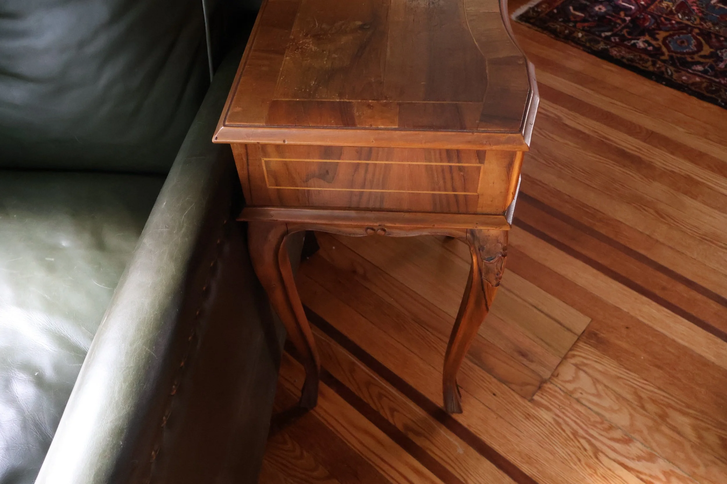 Pristine French style side table with cabriole legs, carved details, and a small drawer, ideal for accompanying an easy chair or as a delightful bedside table. Will only deliver with love and care to NYC.