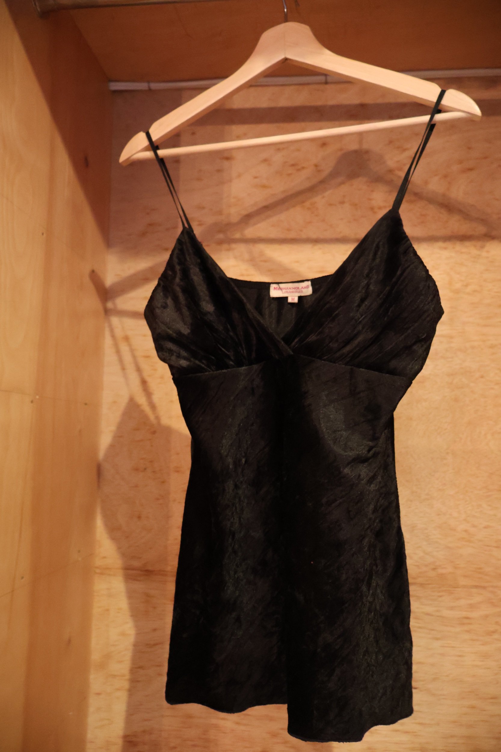 Gorgeous example of the quintessential early 00s going out top. Spaghetti straps, empire waist, crushed velvet, black, she was everything. Made by Meghan Noland in LA, this top was quality and has endured accordingly with minimal wear (the straps were tighter 20 years ago!). Paired with suede flares, denim barrels, or micro shorts, she is versatile and functional. Ready for a new home, she will be lovingly delivered to NYC or shipped nationwide.