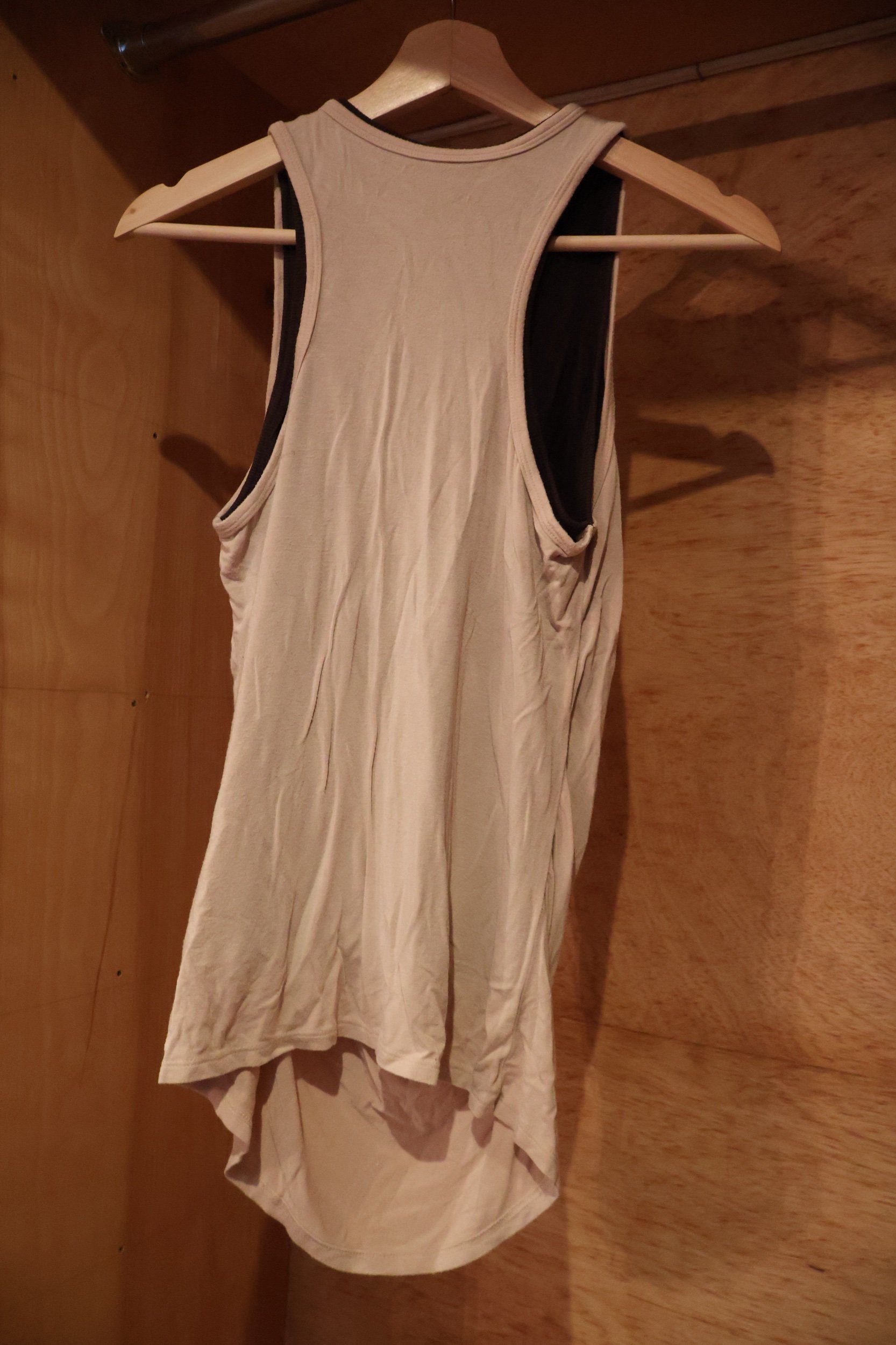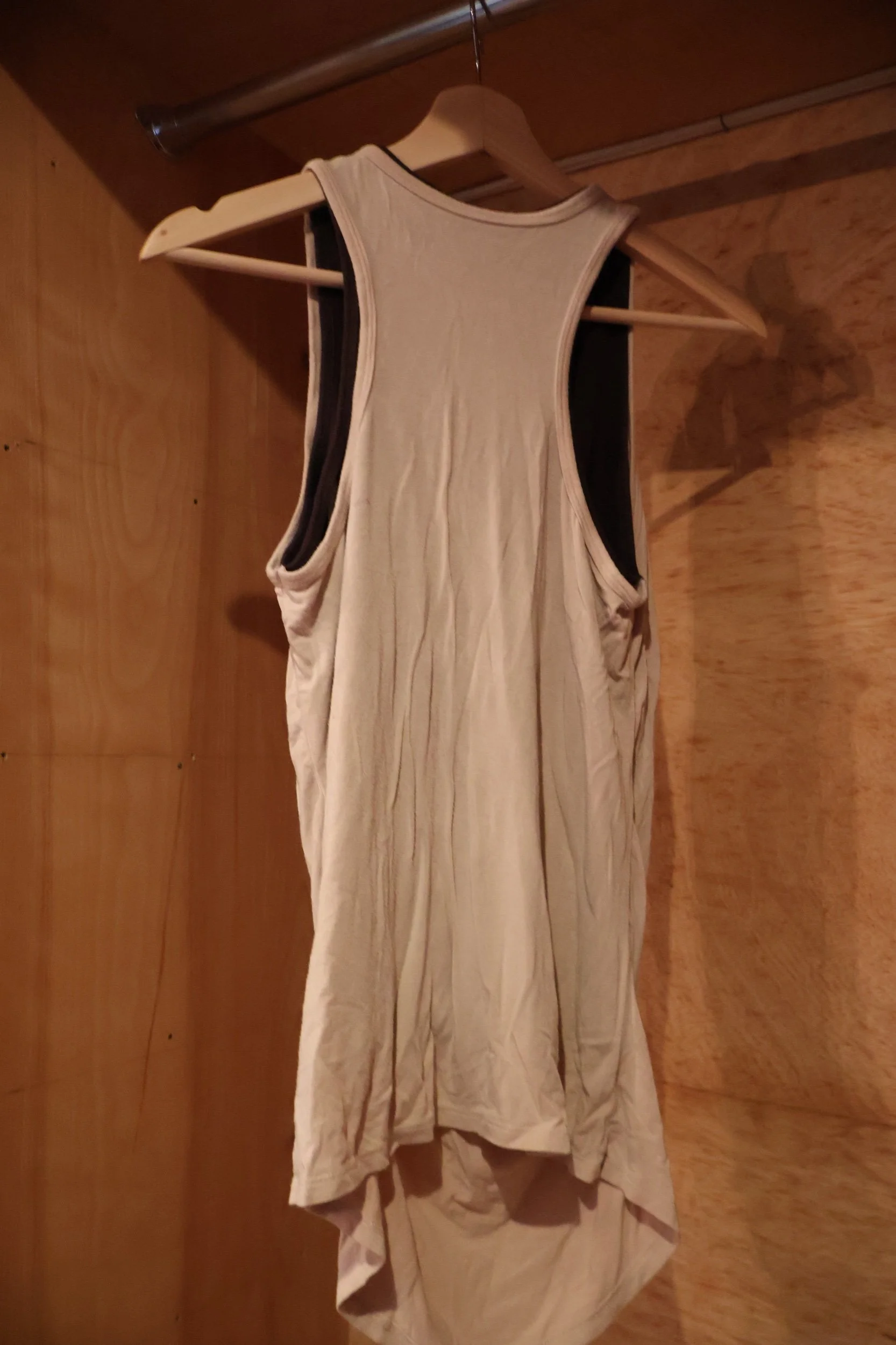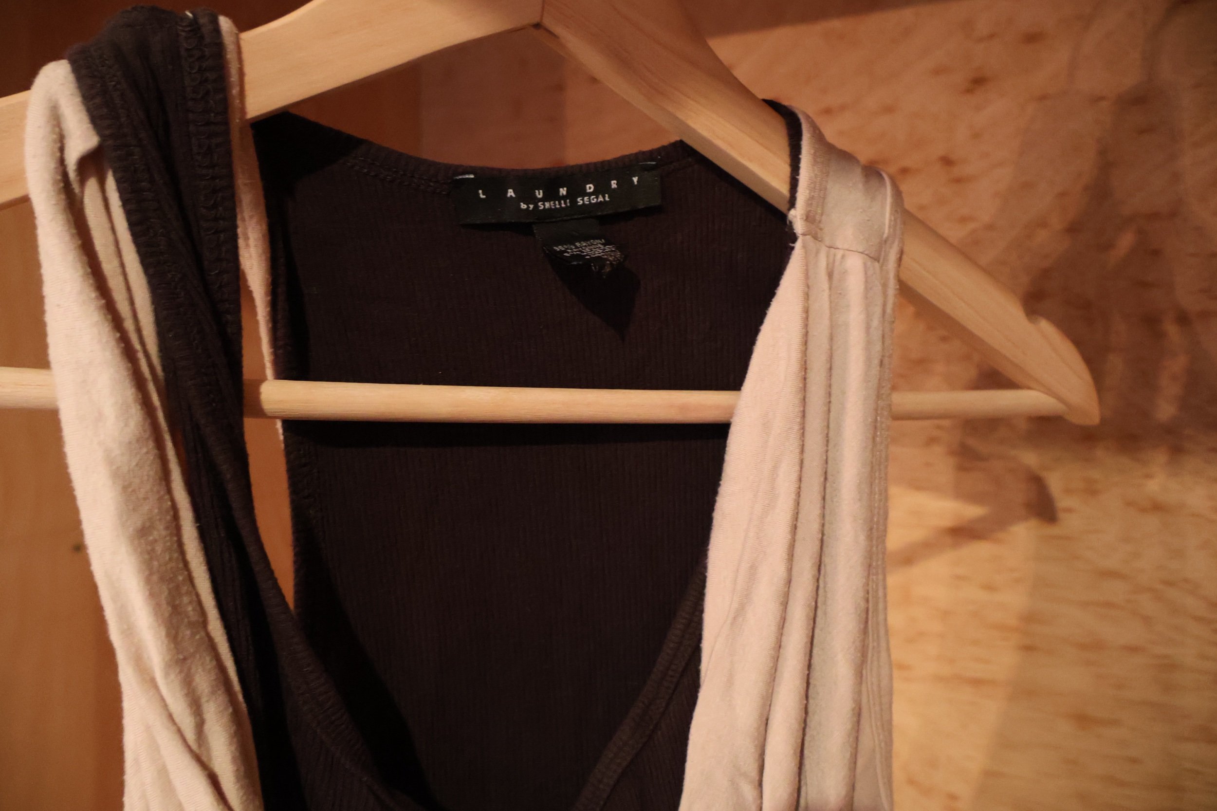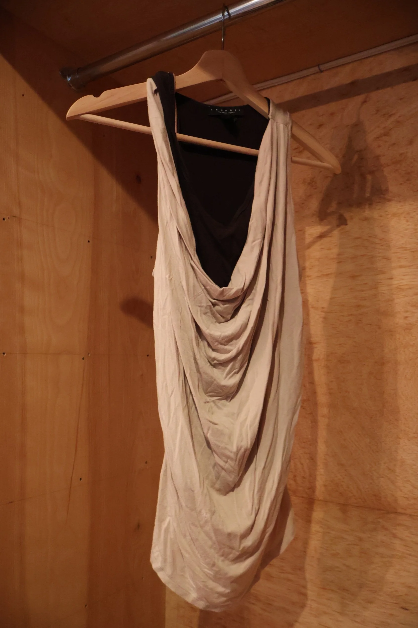 Beige and Cocoa, this vintage 00s tank features a chocolatey tank with beige second layer draping dramatically and finished with a racerback. Most often paired with flares and a pointy toed heel back in the day, now ready for some barrel legs and birks. Size small but with lots of give. Available for local NYC delivery or nationwide shipping