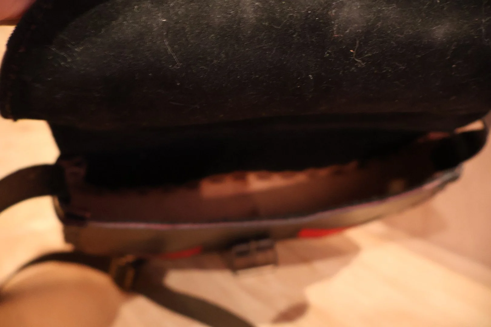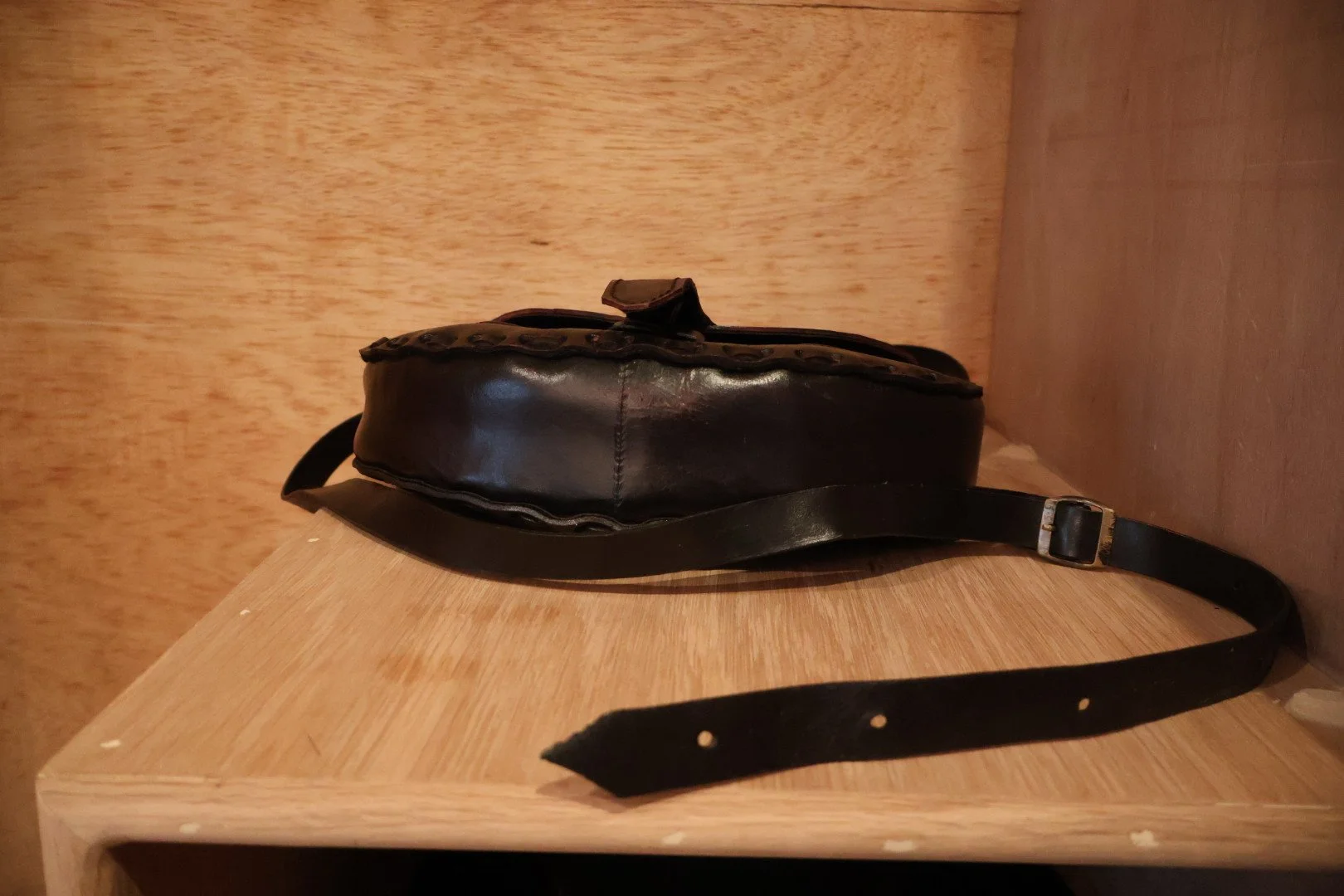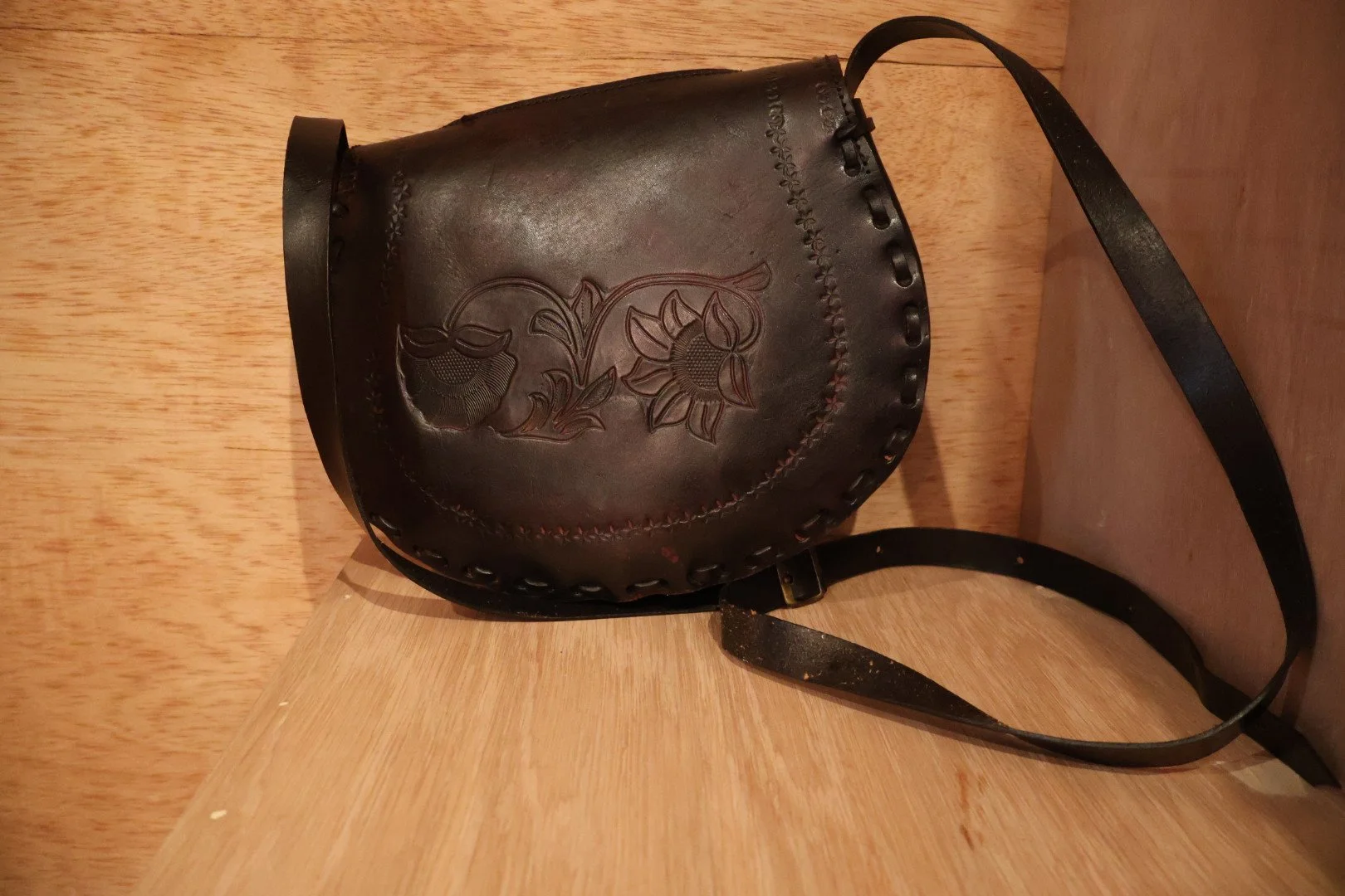 Dark leather bag hand embossed with a floral pattern on the back and featuring a likely handwoven piece of red and orange fabric on the front, other unique features include the metal belt buckle, long leather strap, and otherwise phenomenal condition of this piece. Plenty of room for phone, wallet, keys and more without being cumbersome when hopping the turnstile. Delivered locally to NYC or shipped nationwide.