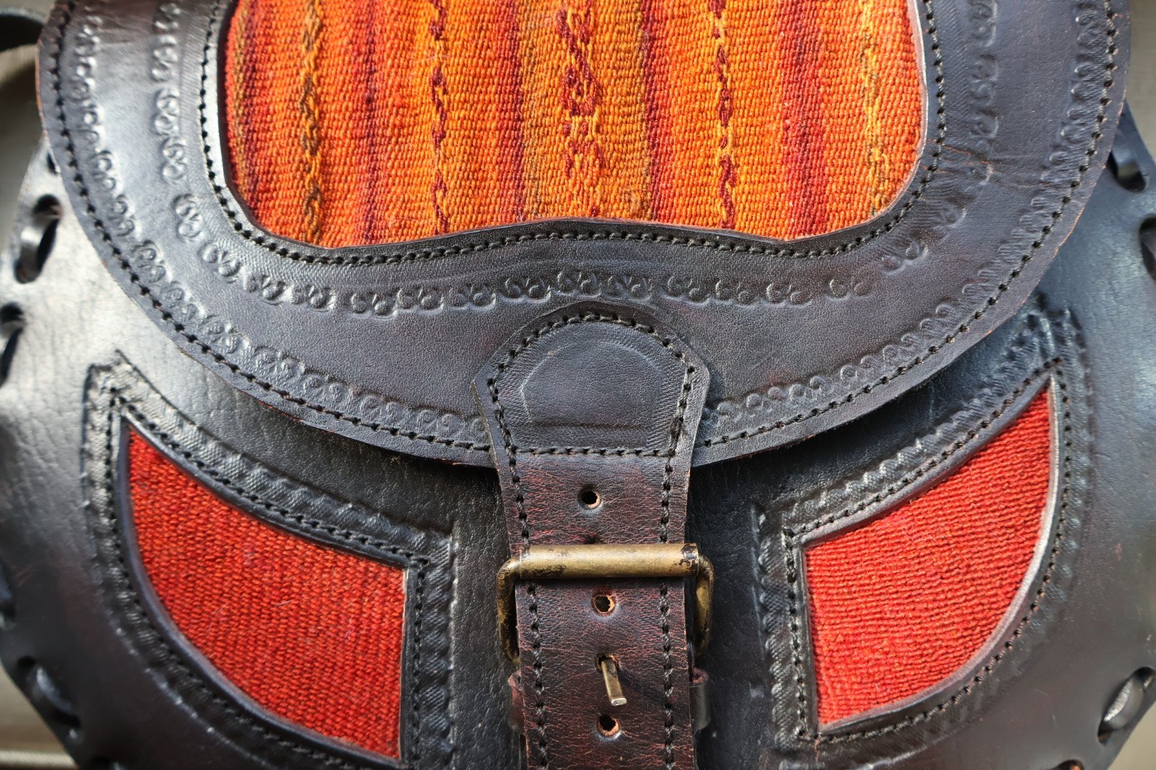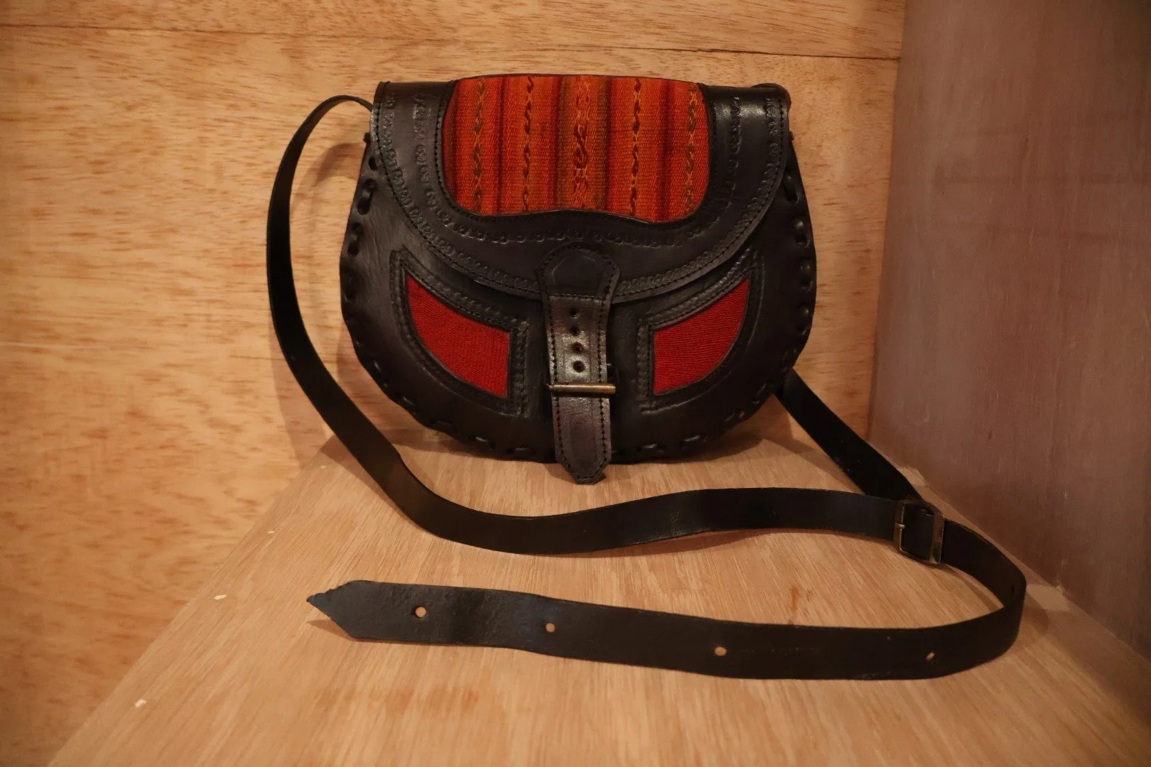 Vintage Hand-Stitched Leather Cross-Body Bag with Red and Orange Handwoven Fabric