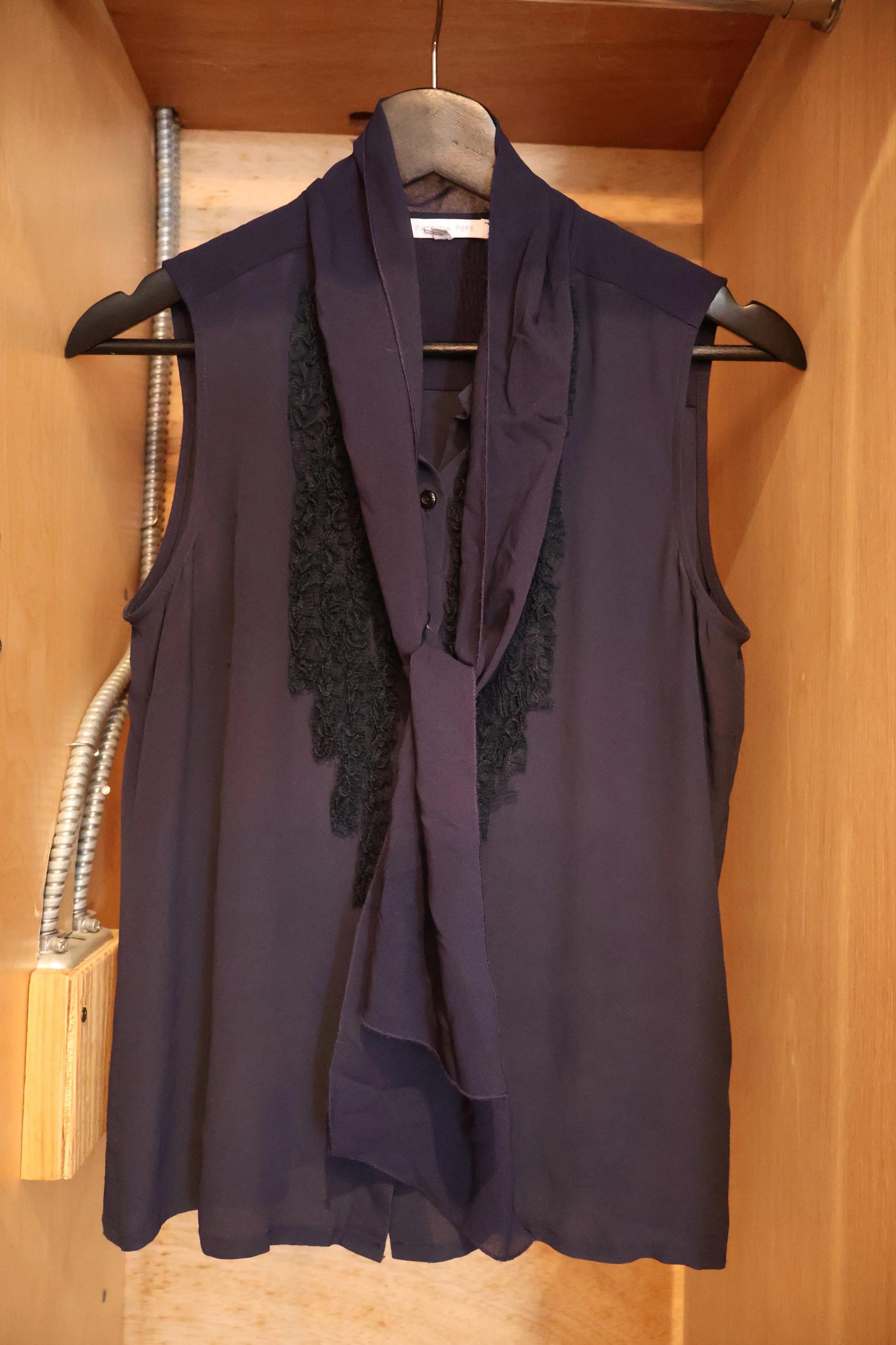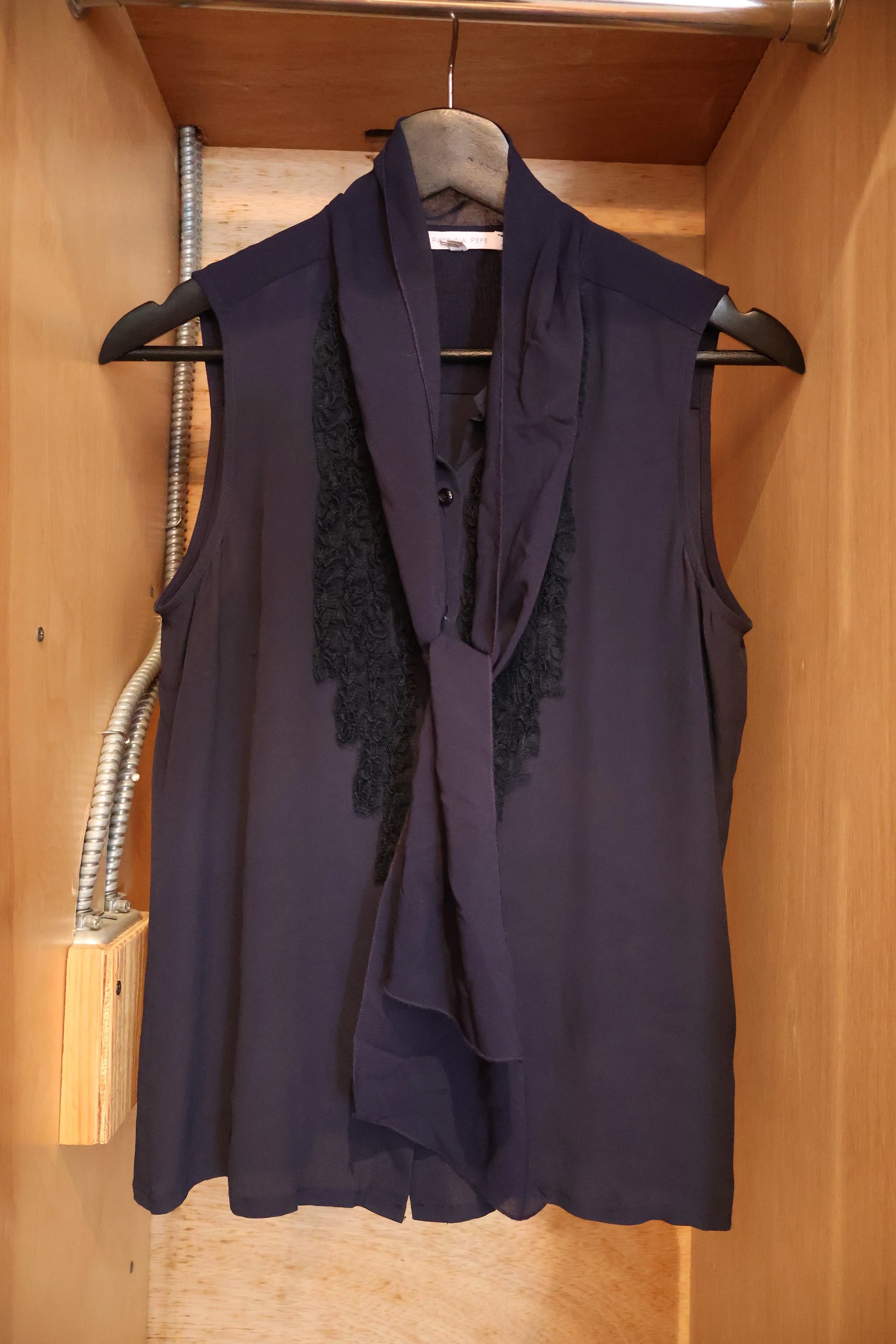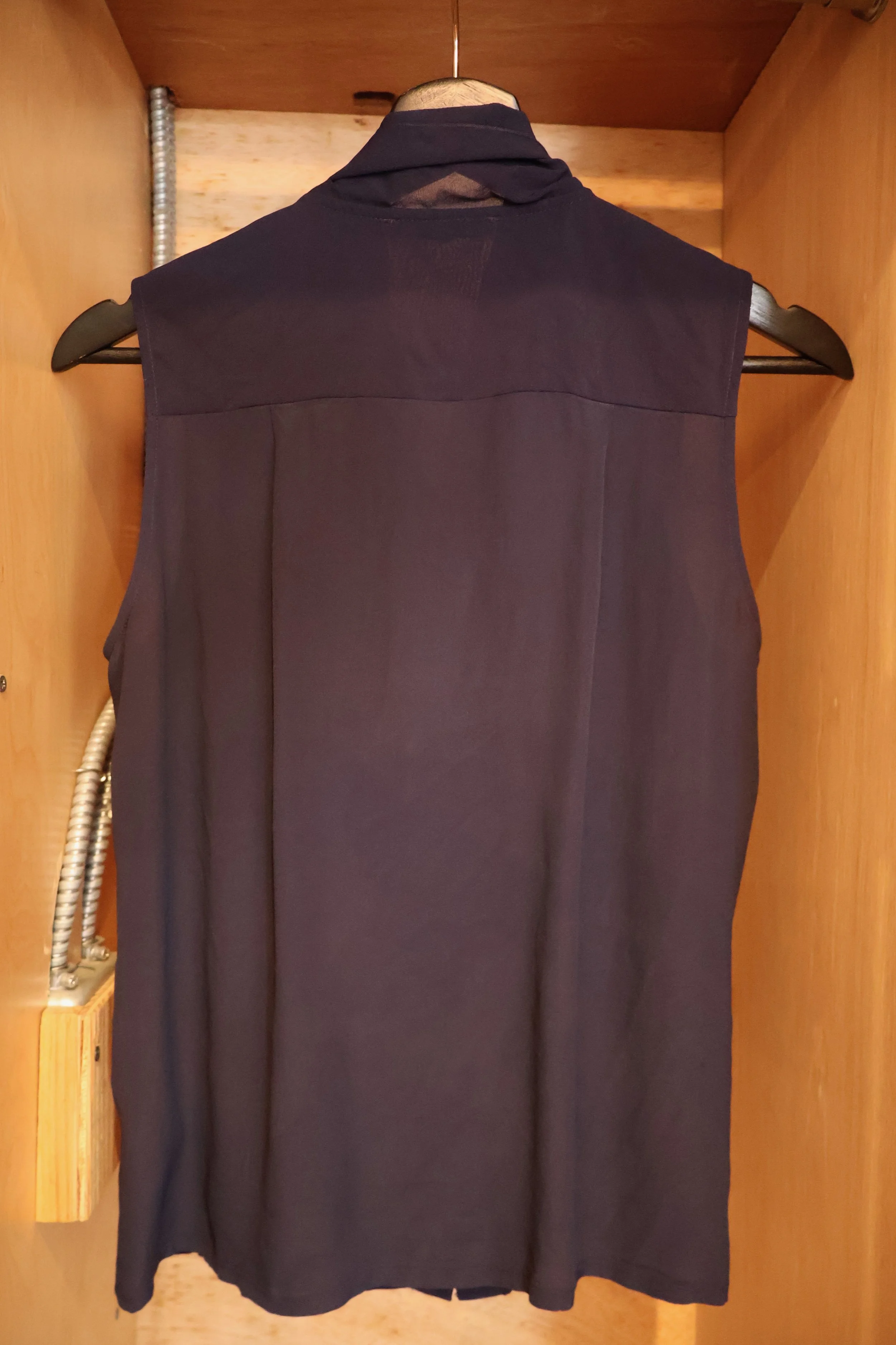 Office, Club, Office to Club? This Italian sized 48 sleeveless blouse was crafted in Romania and is ready for it all. Light wear not noticeable on the details and buttons and tie intact. Available for NYC delivery and nationwide shipping.