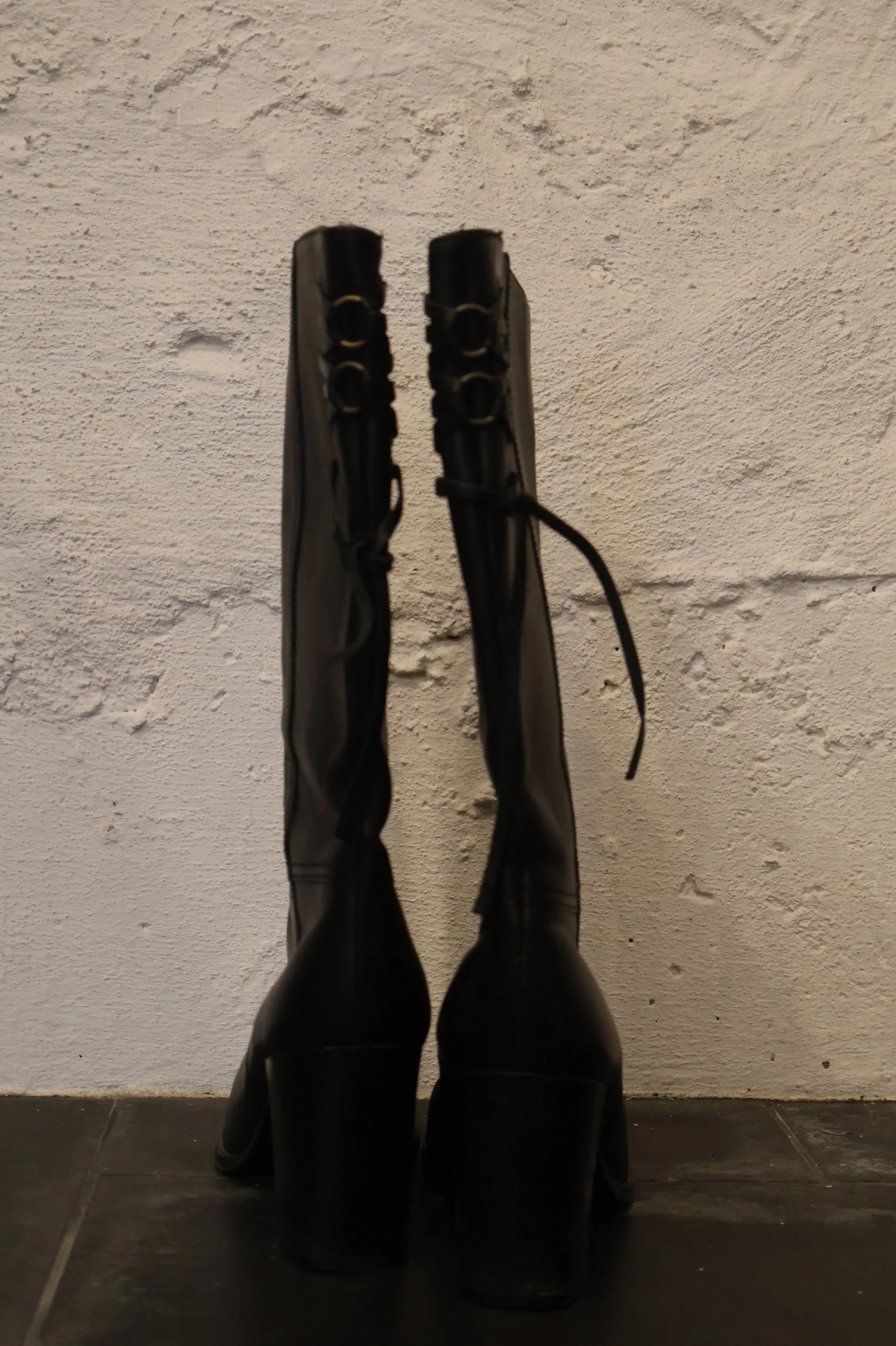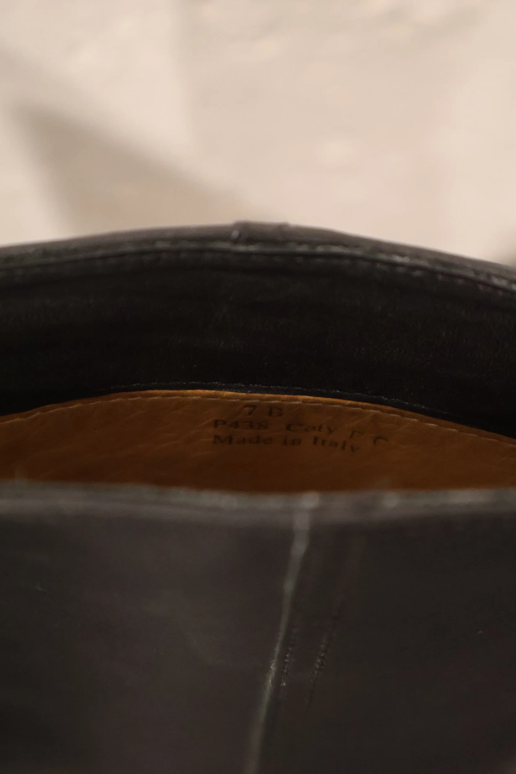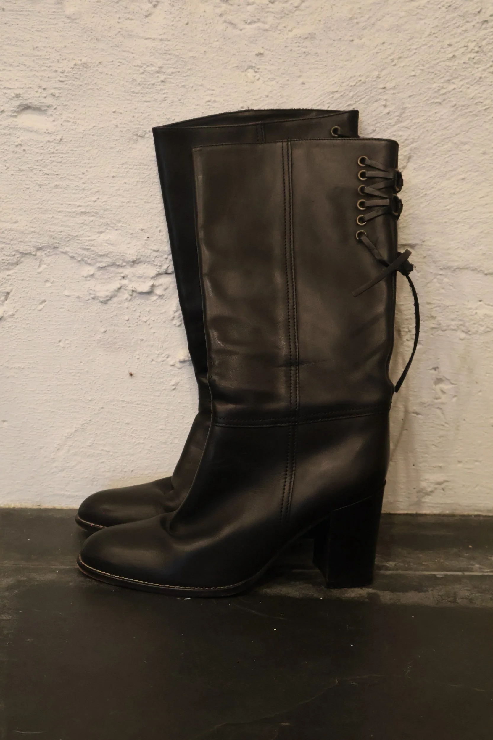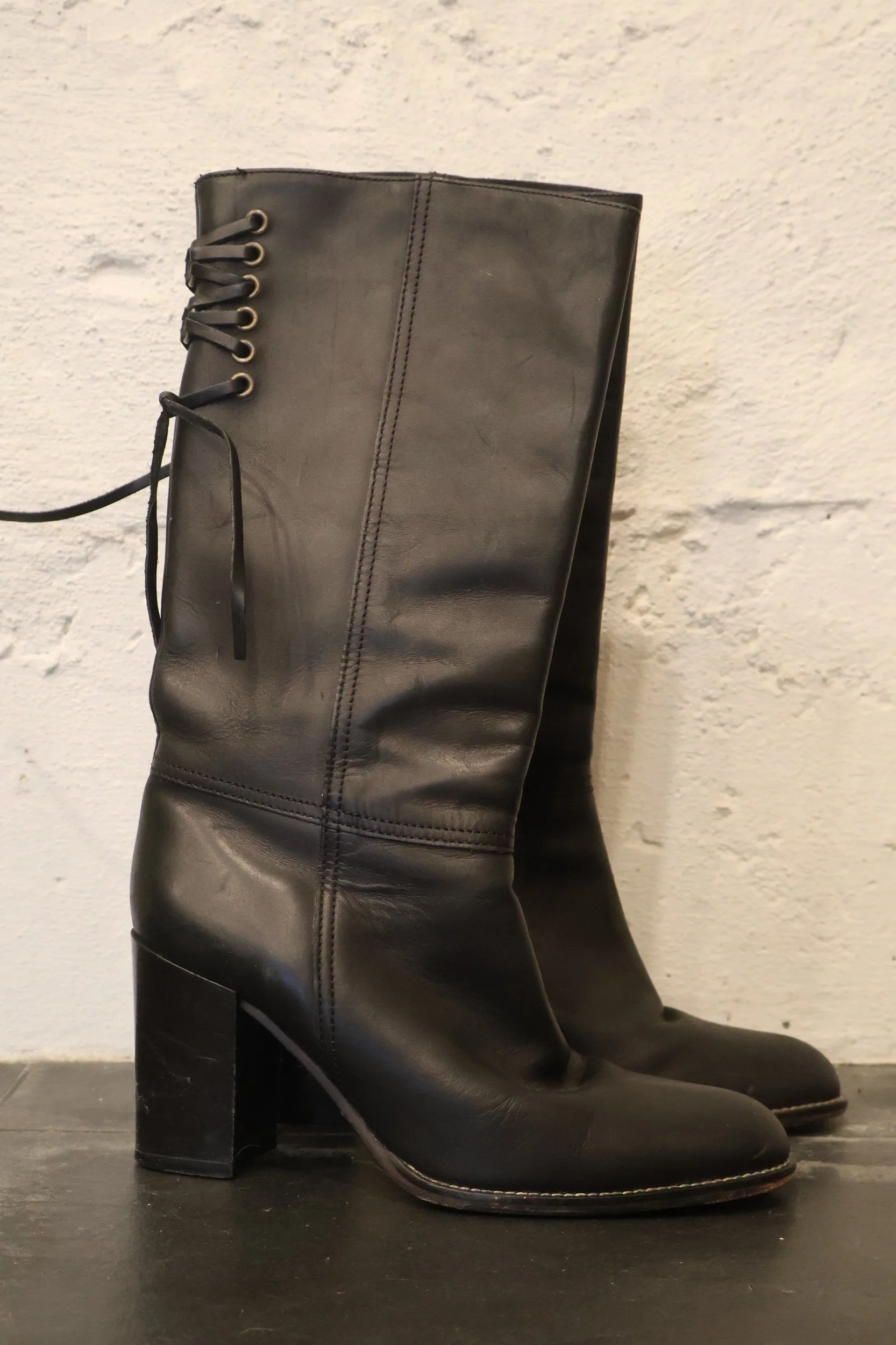 Barely if ever worn size 7 black Coach knee high boots with block heel and laces up the back. Made in Italy, these go with literally everything and feel amazing too. Rare to find such a well preserved pair but luckily my mom’s inspiration outmatched her ambition on this purchase and her closet coughed them up finally for the trend’s resurgence! Delivered locally to NYC and shipped nationwide.